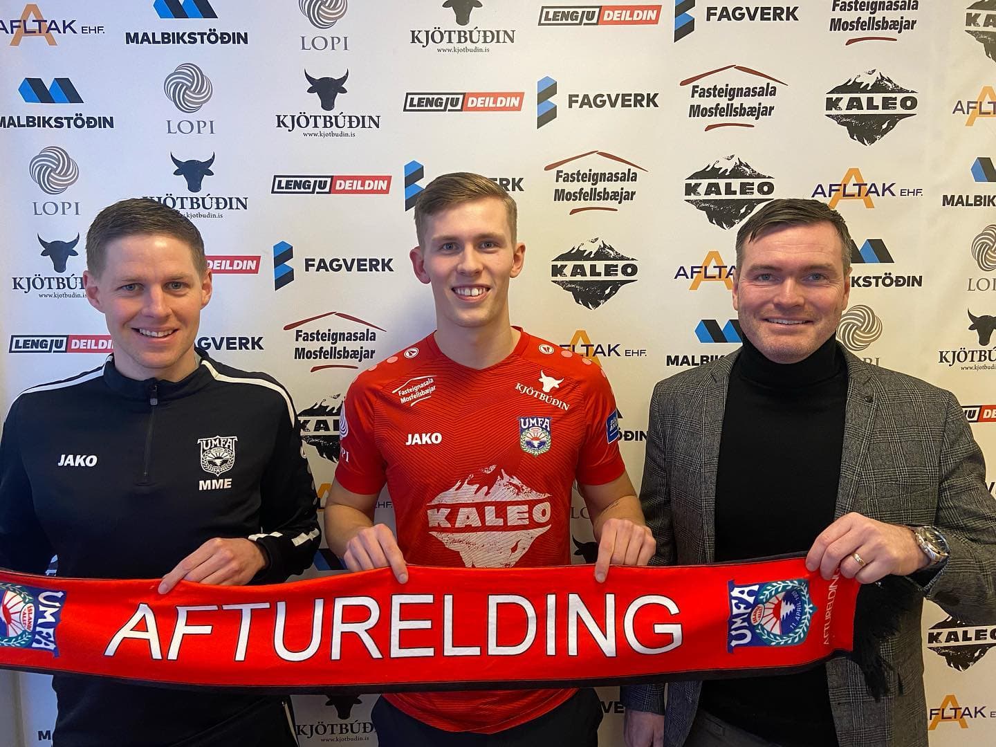 Guðfinnur Þór ásamt Magnúsi Þór Einarssyni, þjálfara meistaraflokks, og Gísla Elvari Halldórssyni, meðstjórnanda í knattspyrnudeild Aftureldingar. Ljósm. umfa
