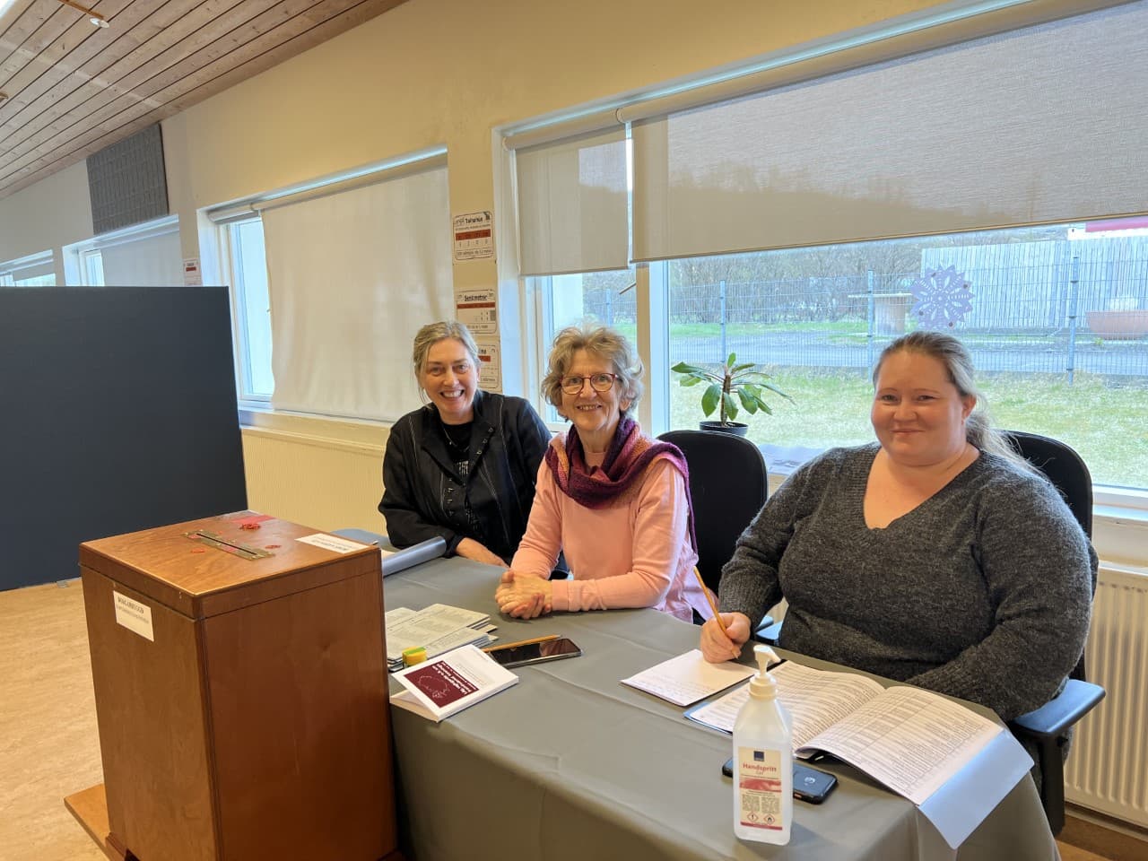 Kjörstjórn á Kleppjárnsreykjum. Þær Elísabet, Jónína og Gunna Mæja glaðbeittar að vanda. Ljósm. Steinunn Þorvaldsdóttir.