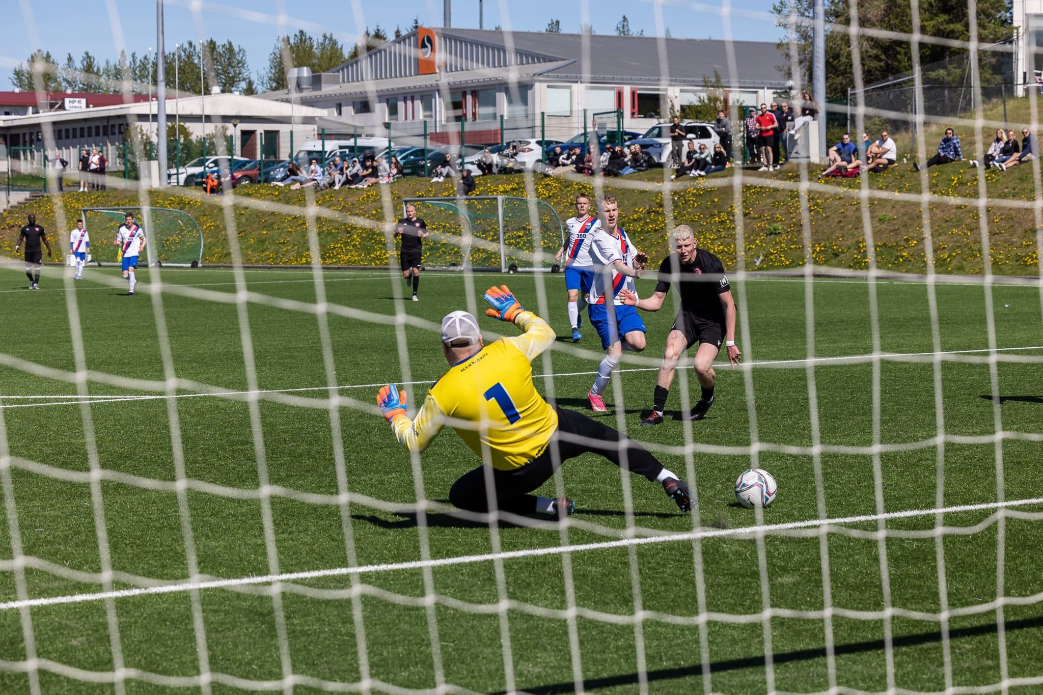 Úr leik Árbæjar og Reynis um helgina. Þarna er boltinn á leiðinni inn en bara í vitlaust mark! Ljósm. tfk