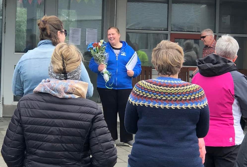 Rebecca fékk blóm frá formanni menningarmálaefndar, Þorgrími Einari Guðbjartssyni. Ljósm. aðsend.