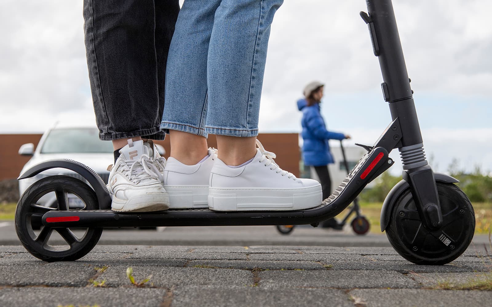 Tvímennt á rafhlaupahjóli sem er stranglega bannað. Ljósm. Víkurfréttir/JPK