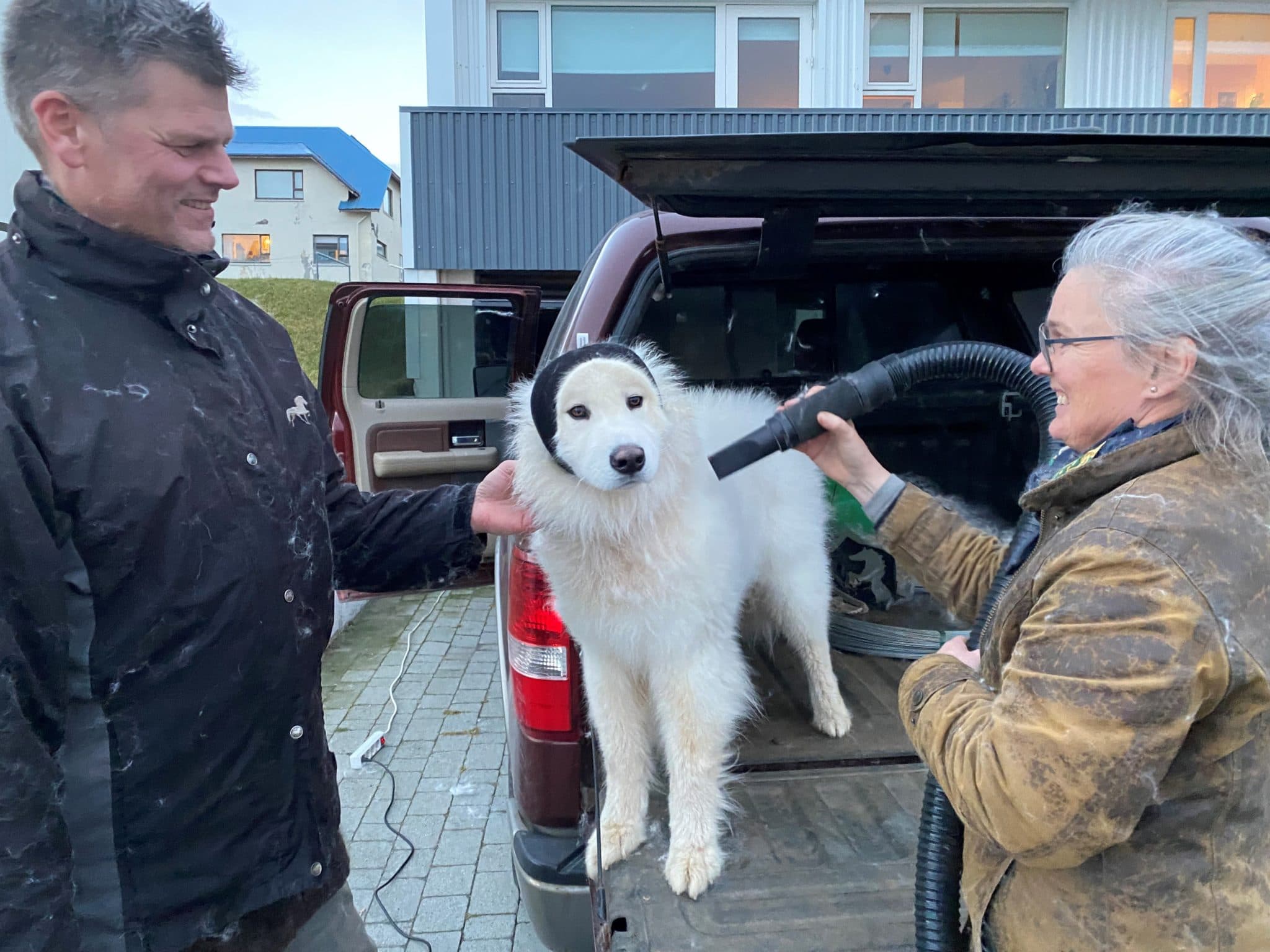 Tindur í þurrkun hjá eigendum sínum.