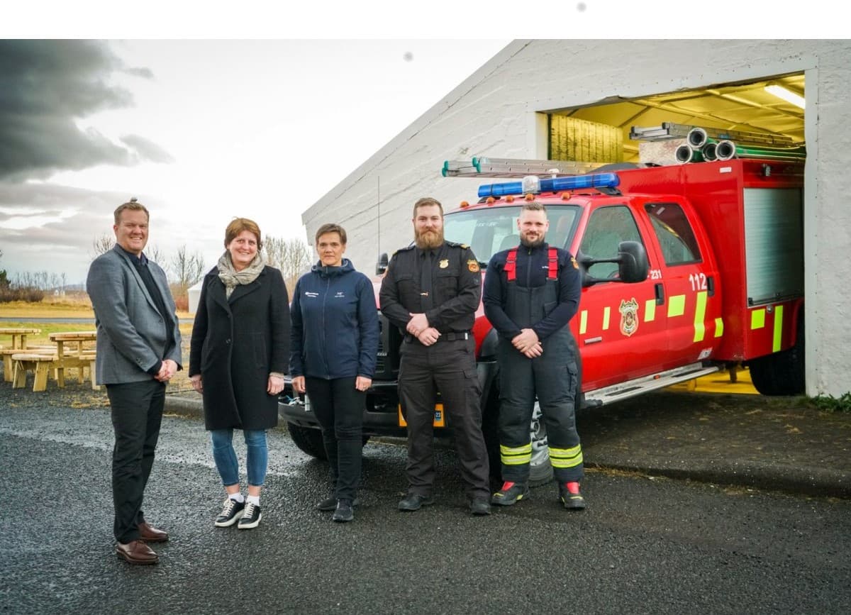 Eftir undirskrift samningsins framan við Hjartarfjós á Hvanneyri. F.v. Stefán Broddi Guðjónsson sveitarstjóri, Ragnheiður I Þórarinsdóttir rektor LbhÍ, Kristín Theodóra Ragnarsdóttir rekstrarstjóri LbhÍ, Heiðar Örn Jónsson varaslökkviliðsstjóri og Vigfús Ægir Vigfússon slökkviliðsmaður. Ljósm. borgarbyggd.is