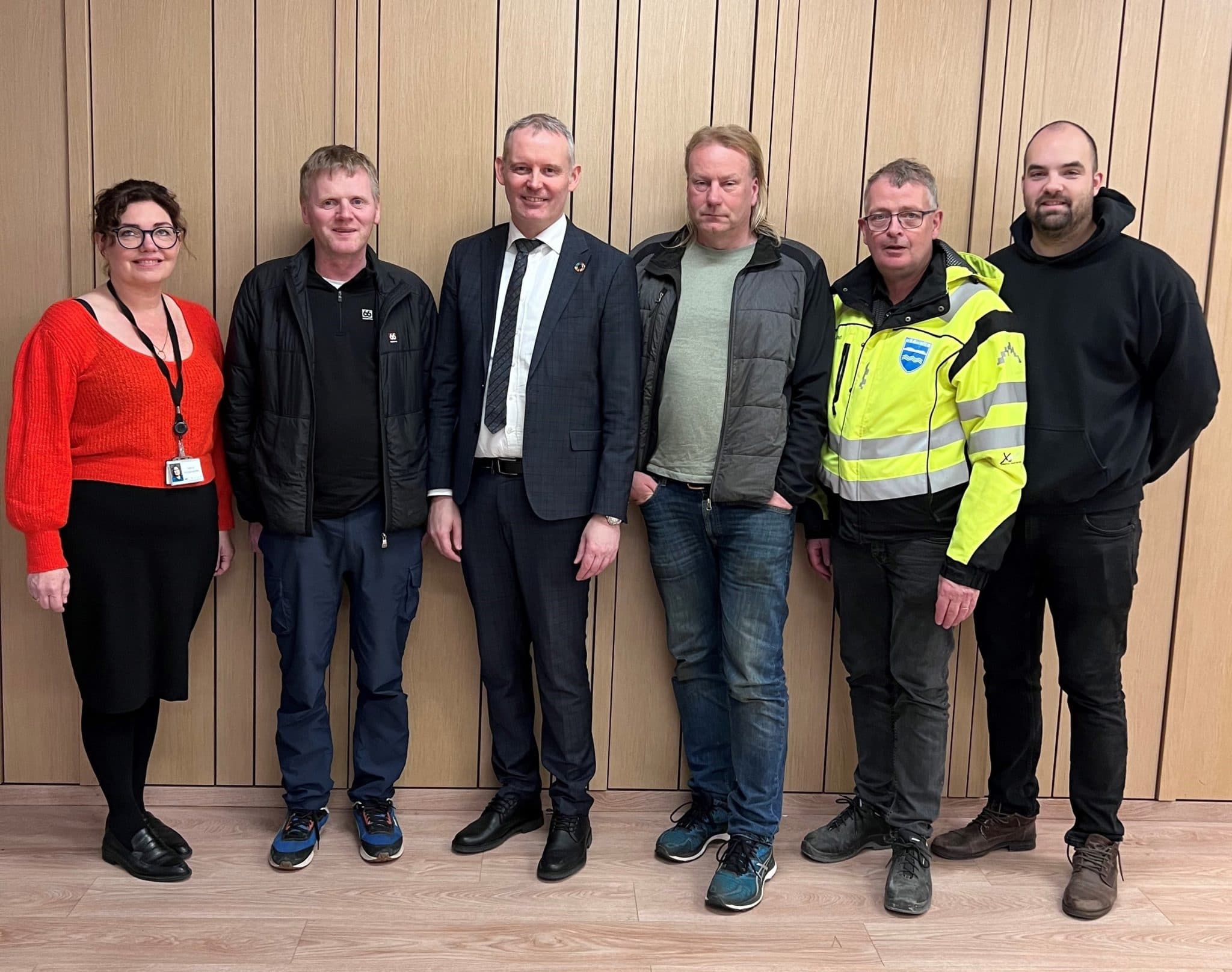 Eftir undirritun samningsins. F.v. Sólrún Kristjánsdóttir framkvæmdastjóri Veitna, Óskar Sigvaldason frá Borgarverki, Sævar Freyr Þráinsson bæjarstjóri, Kristinn Sigvaldason frá Borgarverki, auk þeirra Alfreðs Alfreðssonar og Björns Breiðfjörð Gíslasonar frá skipulagssviði Akraneskaupstaðar. Ljósm. aðsend.