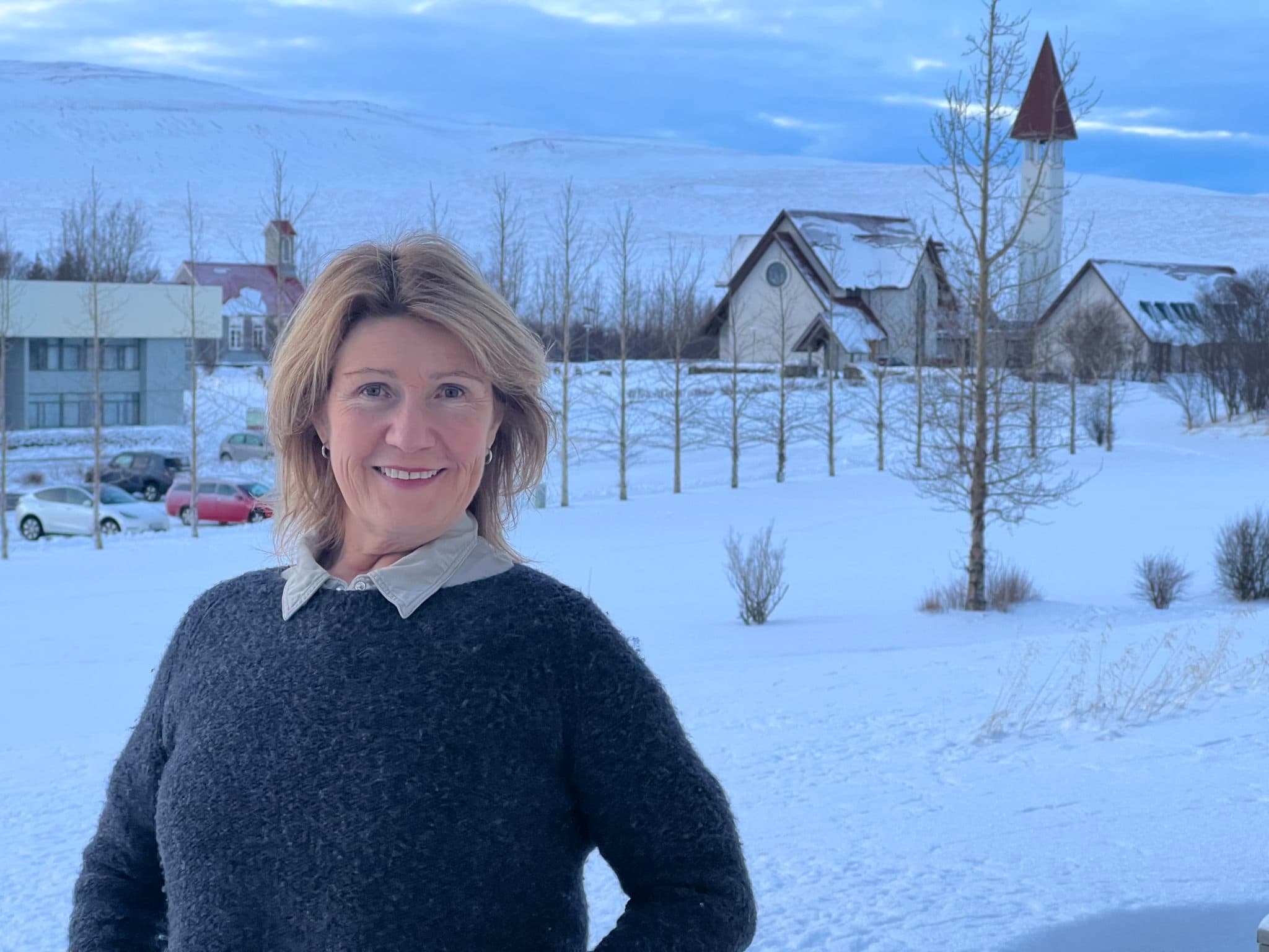 Hólmfríður Friðjónsdóttir með Reykholtskirkju í baksýn. Ljósm. sþ.