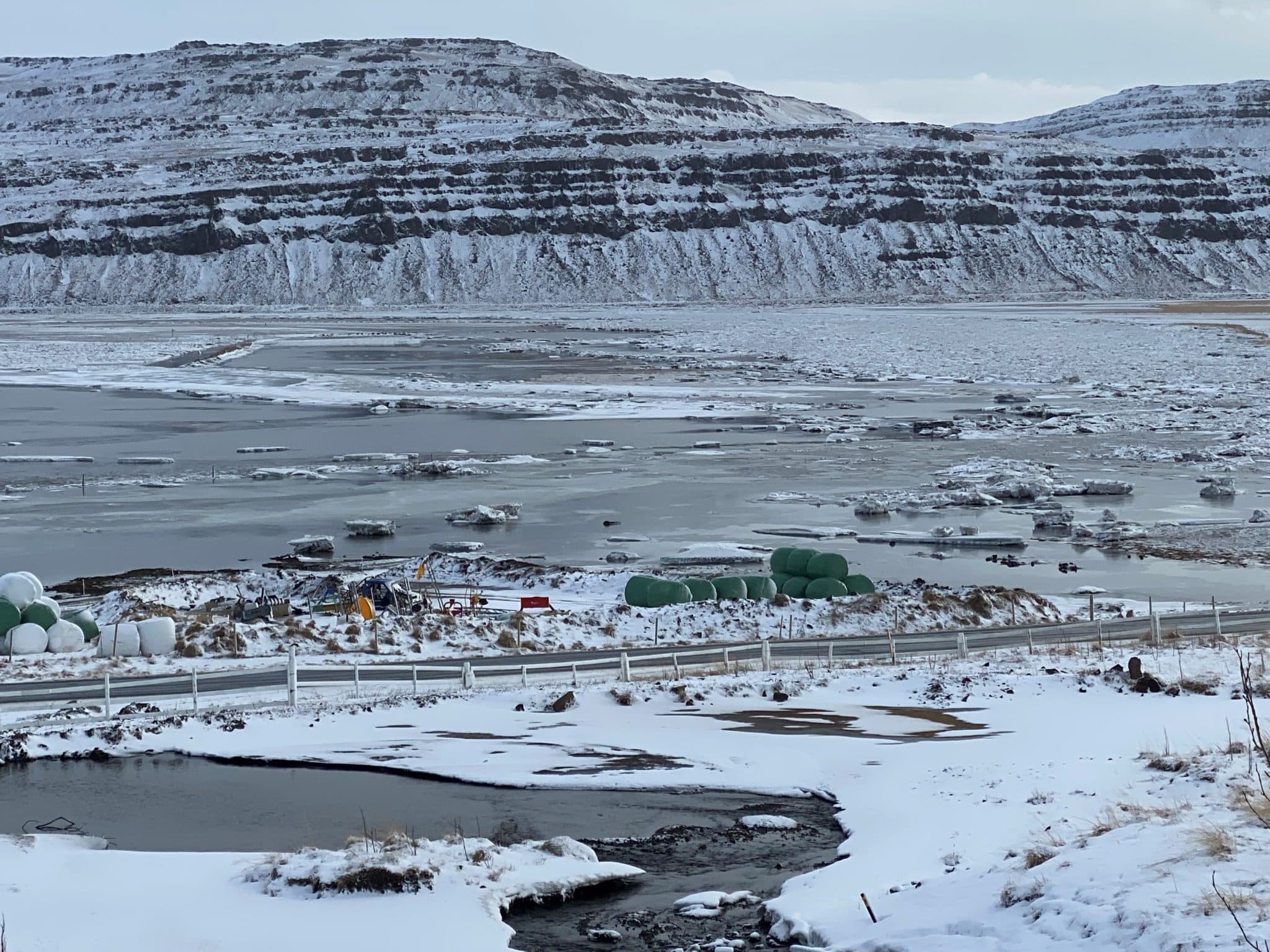 Norðuráin séð frá Hraunsnefi um tvöleitið í dag, mánudag.