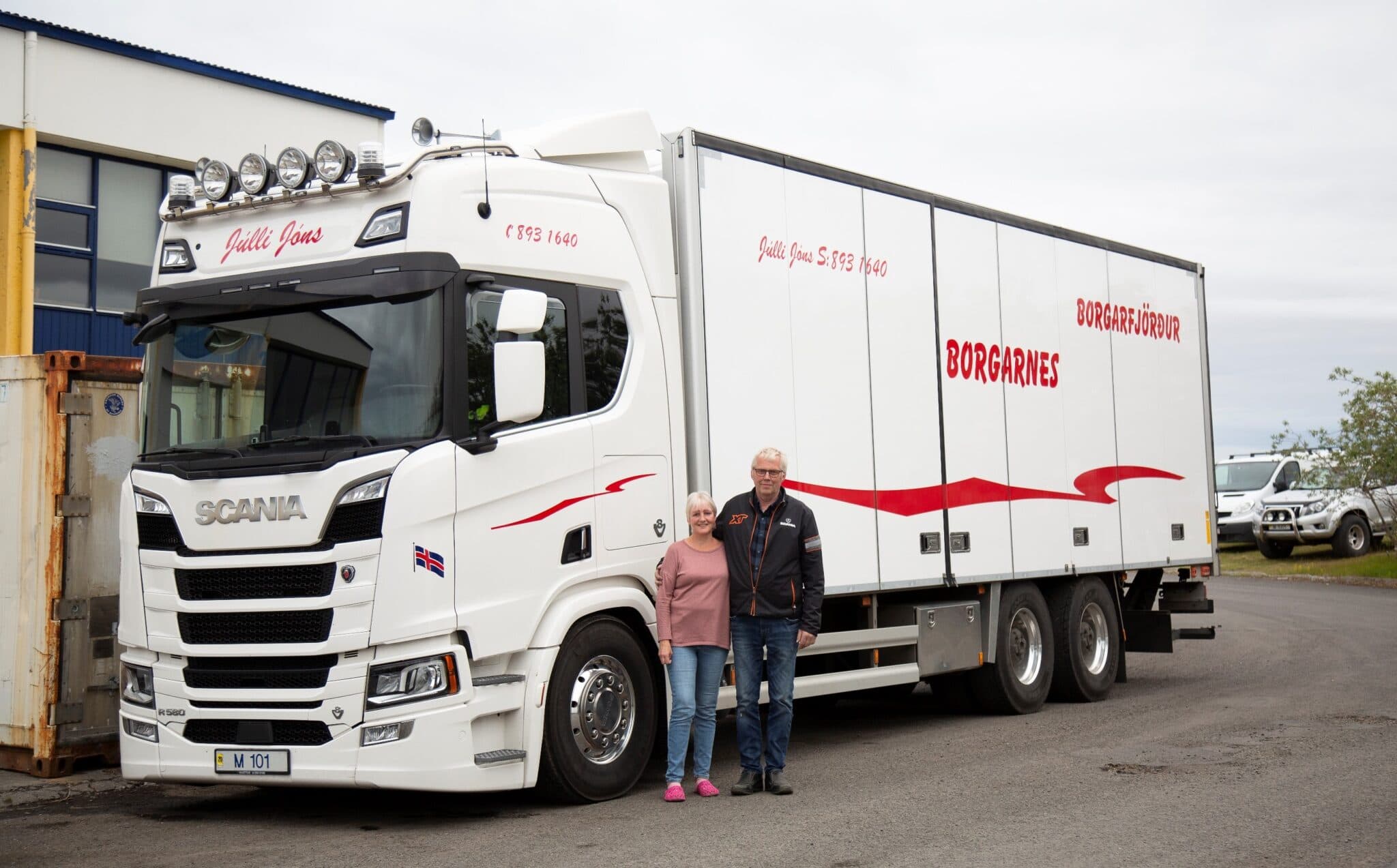 Júlli Jóns og Inga Kolfinna Ingólfsdóttir eiginkona hans við einn flutningabílinn í flotanum. Ljósm. úr safni Skessuhorns.