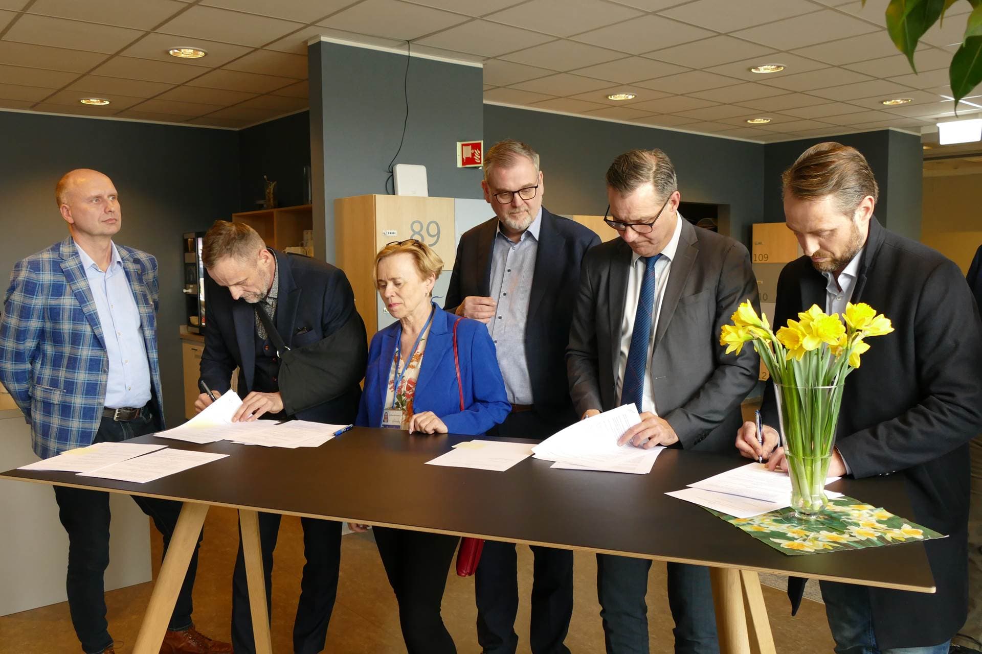 Samningana undirrituðu Sigurður Helgason fyrir hönd Sjúkratrygginga Íslands, Sigurður Ingibergur Björnsson fyrir hönd Klíníkurinnar, Willum Þór Þórsson heilbrigðisráðherra og þeir Fidel Helgi Sanchez og Benedikt Árni Jónsson fyrir hönd Handlækningastöðvarinnar í Glæsibæ. Ljósm. Stjórnarráðið.