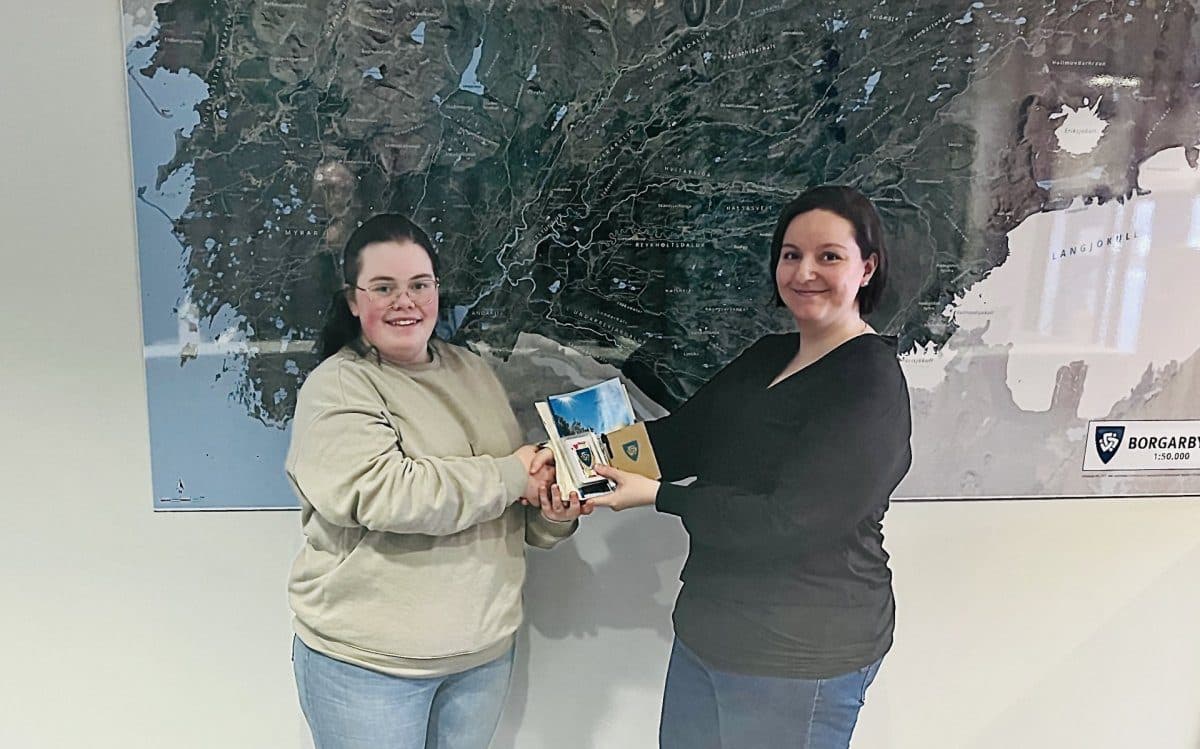 María Neves samskiptastjóri Borgarbyggðar afhenti Guðrúnu Katrínu Ólafsdóttur fyrsta móttökupakkann en hún var fyrsti nýi íbúinn til að fá hann afhentan. Ljósm. borgarbyggd.is