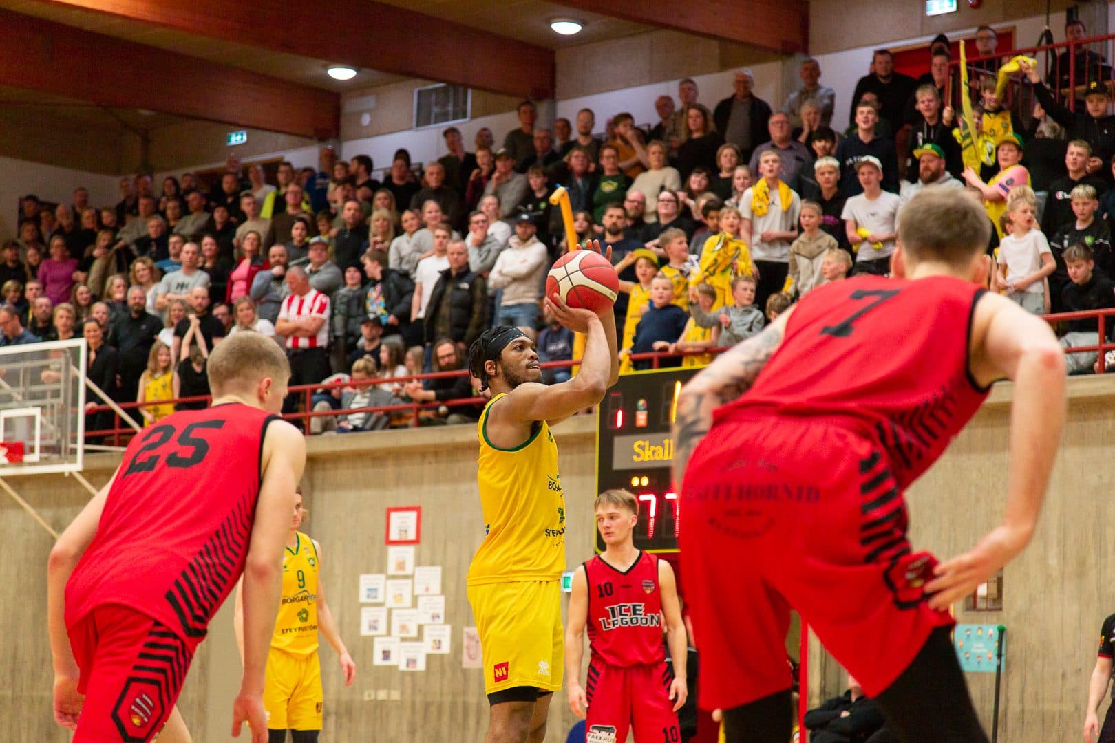 Hamar og Skallagrímur áttust við í fyrsta leiknum í úrslitaeinvíginu um sæti í Subway deild karla í körfuknattleik í gærkvöldi og var leikurinn í Hveragerði. Hátt í 300 hundruð manns voru mættir í Frystikistuna og þar á meðal heil rúta frá Borgarnesi með stuðningsmenn Skallagríms innanborðs. Það var jafnt á flestum tölum í fyrsta leikhluta en Milorad Sedlarevic og Davíð Guðmundsson sáu til þess að Skallagrímur hafði sex stiga forystu eftir að hafa sett niður tvo þrista, staðan 14:20 fyrir Skallagrími. Gestirnir héldu frumkvæðinu framan af í öðrum leikhluta og náðu mest ellefu stiga forskoti eftir tæpan fimm mínútna leik. En þá tóku heimamenn við sér og höfðu náð að minnka muninn í sex stig þegar flautað var til hálfleik, staðan 32:38 Skallagrími í vil.