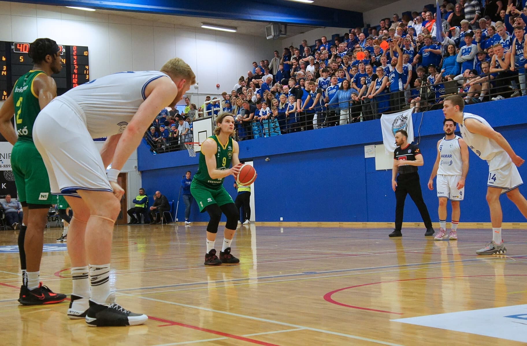 Það var troðfull stúka og mikil stemning í Frystikistunni í Hveragerði í gærkvöldi þegar lið Hamars og Skallagríms áttust við í úrslitaleik um sæti í Subway deildinni í körfuknattleik karla á næsta tímabili. Næstum 500 stuðningsmenn voru mættir til að styðja sín lið og létu vel í sér heyra allan leikinn og miklu meira en það.