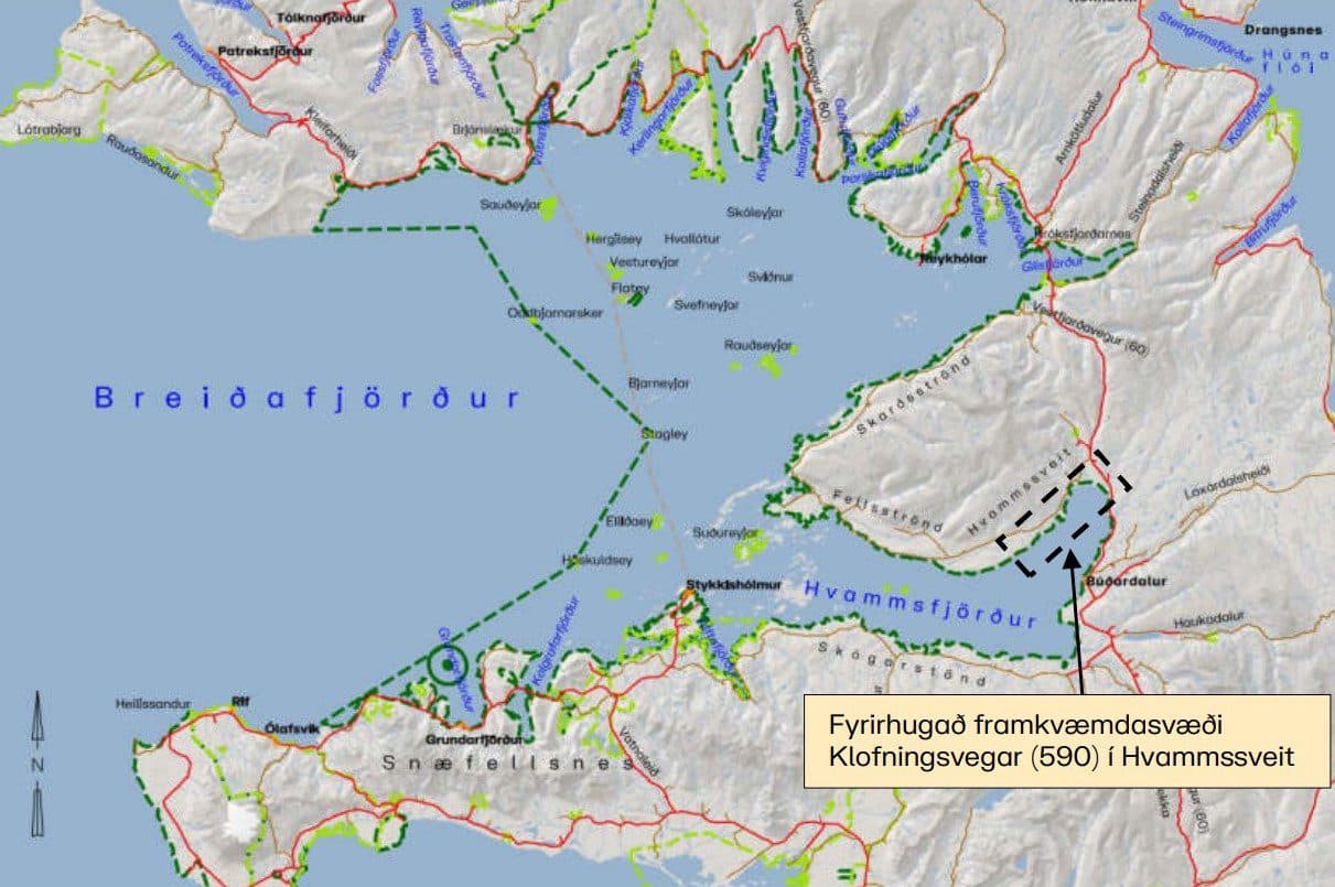 Austasti hluti Klofningsvegar er eins og sjá má við „stóru tána“ á stígvéli Hvammsfjarðar. Teikning: Vegagerðin.