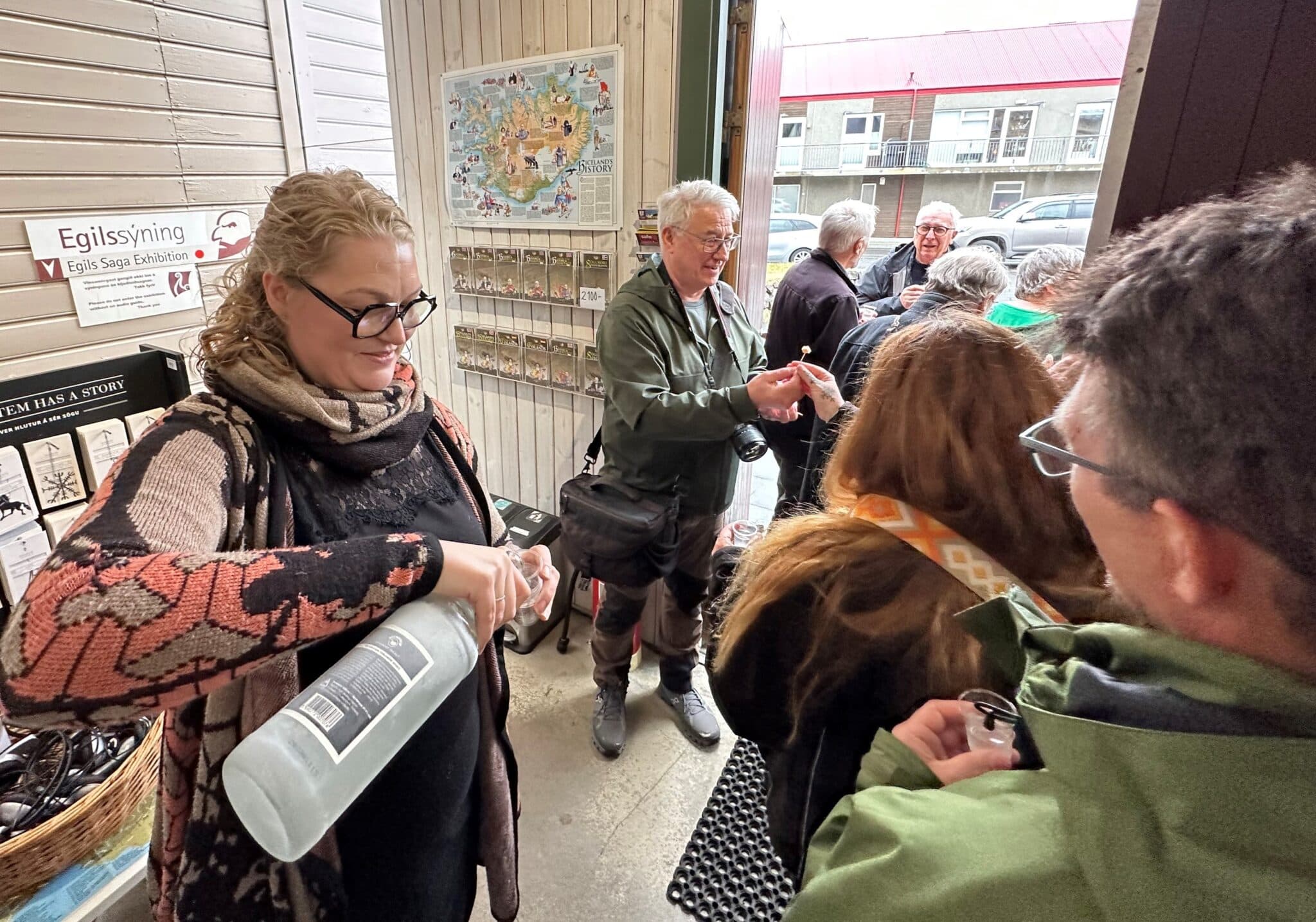 Þegar heimsókn á Landnámssetrið í Borgarnesi lauk var gestum boðið að gæða sér á íslensku Brennivíni og hákarli. Helga Margrét í Landsnámssetrinu og Rögnvaldur útdeildu veitingunum. Ljósm. mm.