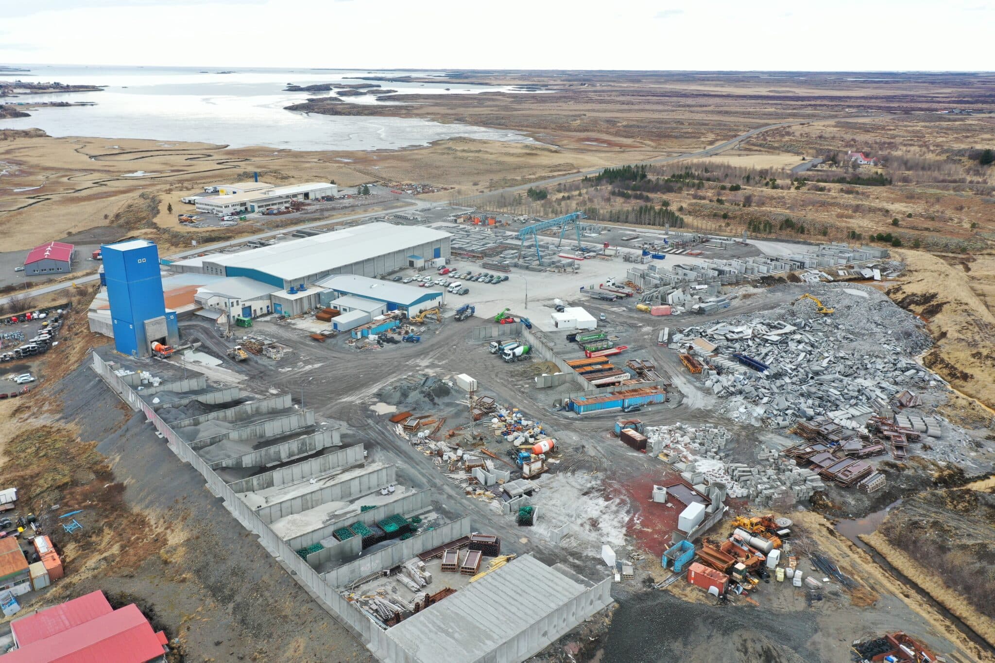 Horft til suðurs yfir athafnasvæði Steypustöðvarinnar í Borgarnesi. Nær er einingaverksmiðjan sem til stendur að stækka en starfsemi er einnig neðan við þjóðveginn í fyrrum Mjólkursamlagshúsi.