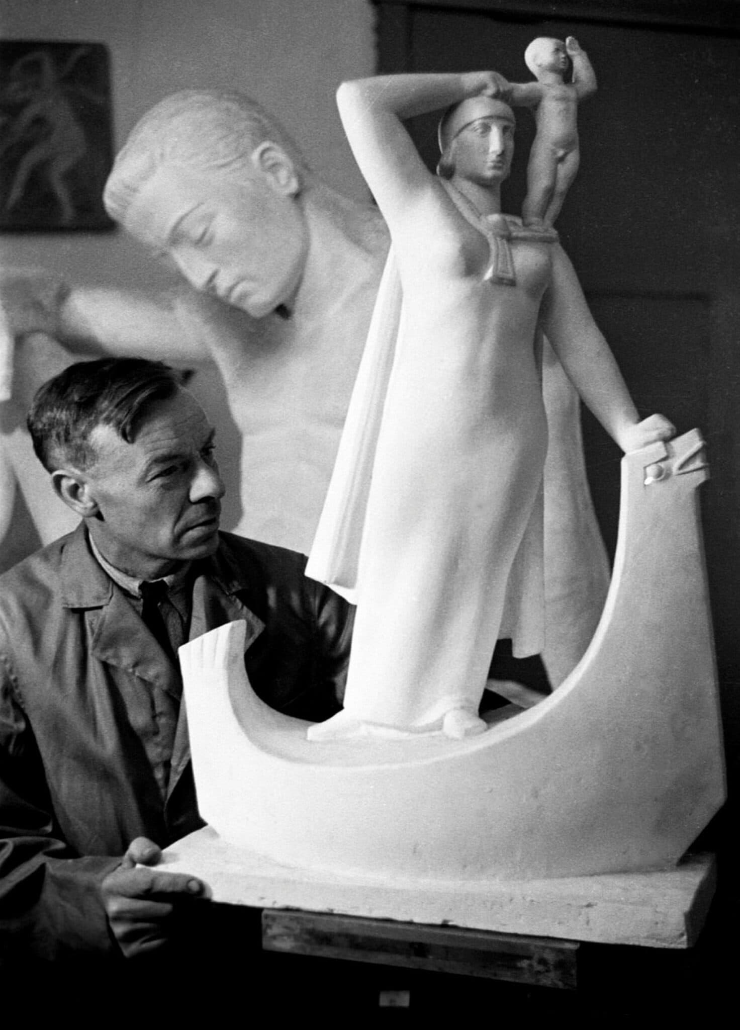 Hér er Ásmundur Sveinsson að vinna við frumgerð styttunnar af Guðríði, Fyrsta hvíta móðirin í Ameríku. Myndin er tekin á vinnustofu Ásmundar árið 1937 en styttan var send á heimssýninguna í New York 1939. Afsteypa af henni er m.a. við Laugarbrekku á Snæfellsnesi og komst á síðasta ári í fréttir þegar henni var stolið og notuð sem hluti af skúlptúr. Ljósm. Vigfús Sigurgeirsson.