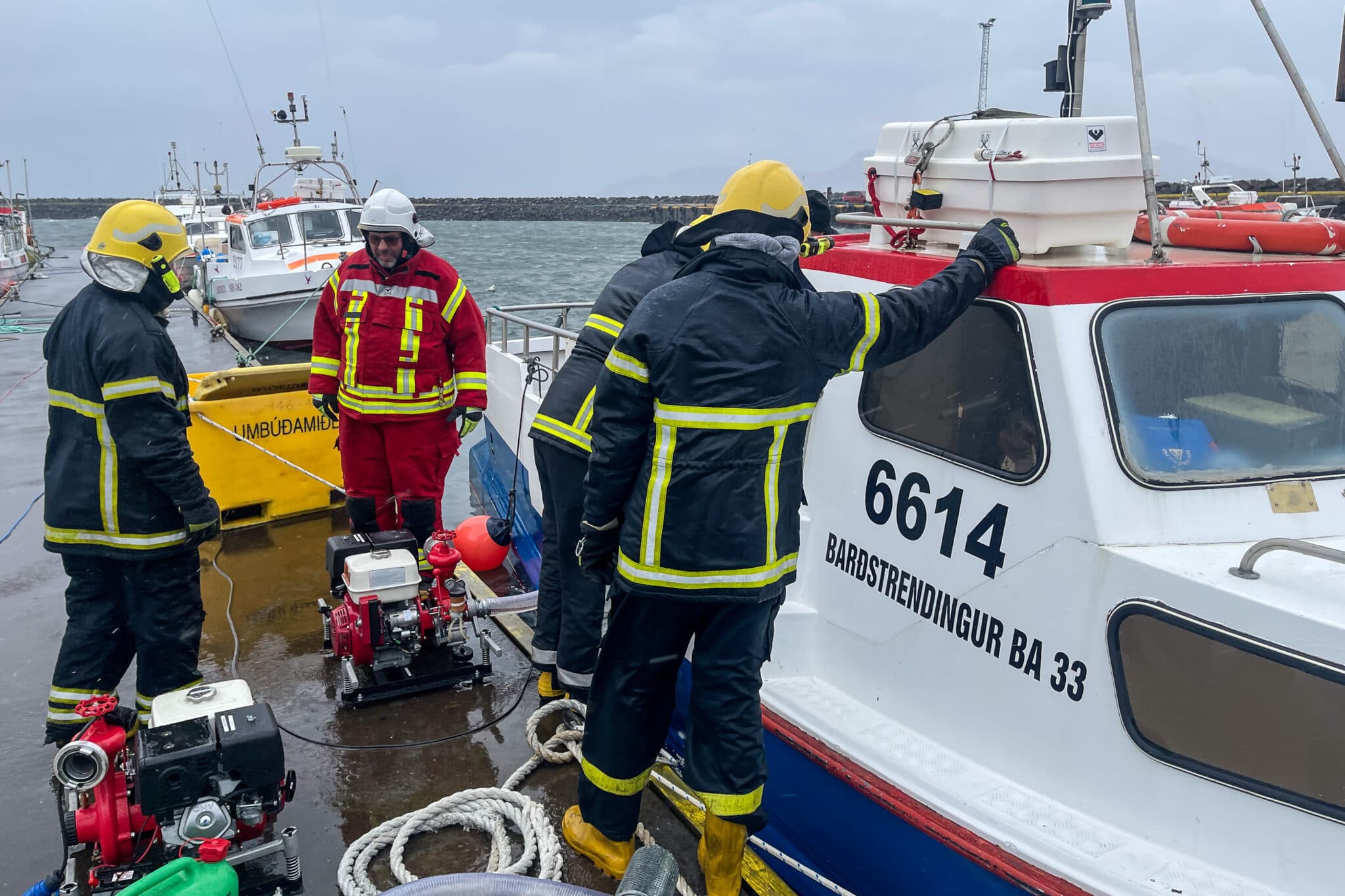 Slökkviliðið dælir upp úr strandveiðibátnum Barðstrendingi BA-33 sem lá við festar í Grundarfjarðarhöfn. Ljósm. tfk