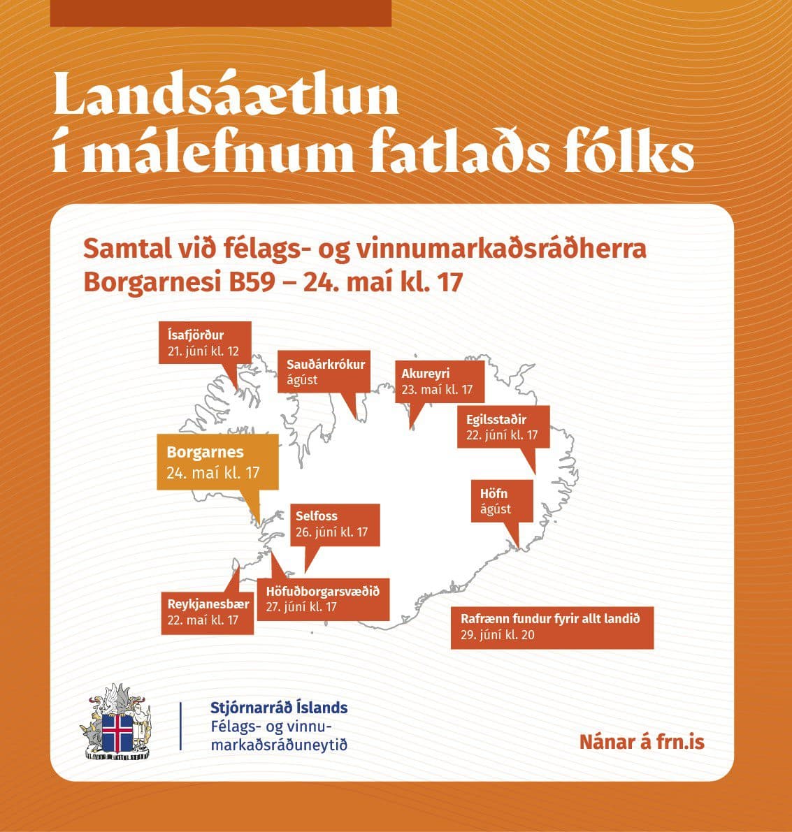Guðmundur Ingi Guðbrandsson, félags- og vinnumarkaðsráðherra, býður til opinna samráðsfunda um landið. Á fundunum verður fjallað um helstu áherslur í þjónustu við fatlað fólk í nútíð og framtíð og hvernig staðið verður að innleiðingu þeirra. Samráðsfundirnir hafa þann tilgang að tryggja milliliðalaust samtal um það sem fólki er efst í huga þegar málefni fatlaðs fólks ber á góma. Ráðherra verður í Borgarnesi, á B59, nú á miðvikudaginn 24. maí kl. 17:00.