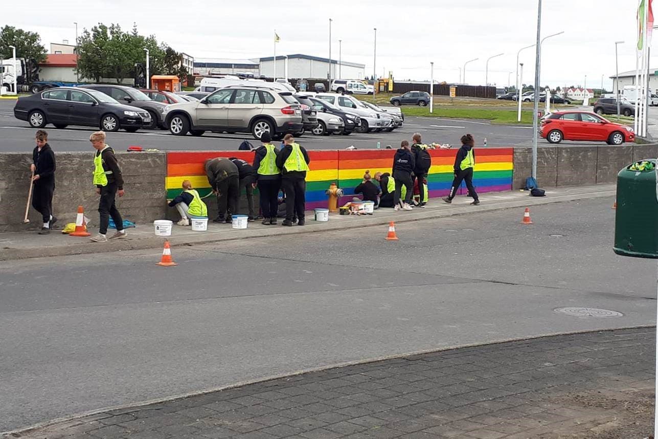 Ungmenni í vinnuskóla Borgarbyggðar máluðu sumarið 2020 í litum regnbogafánans hluta af steinvegg sem afmarkar bílastæði N1 og Brúartorgs. Í þessum anda ætla fjögur sveitarfélög á Vesturlandi að efla list í vinnuskólunum. Ljósm. úr safni Skessuhorns.