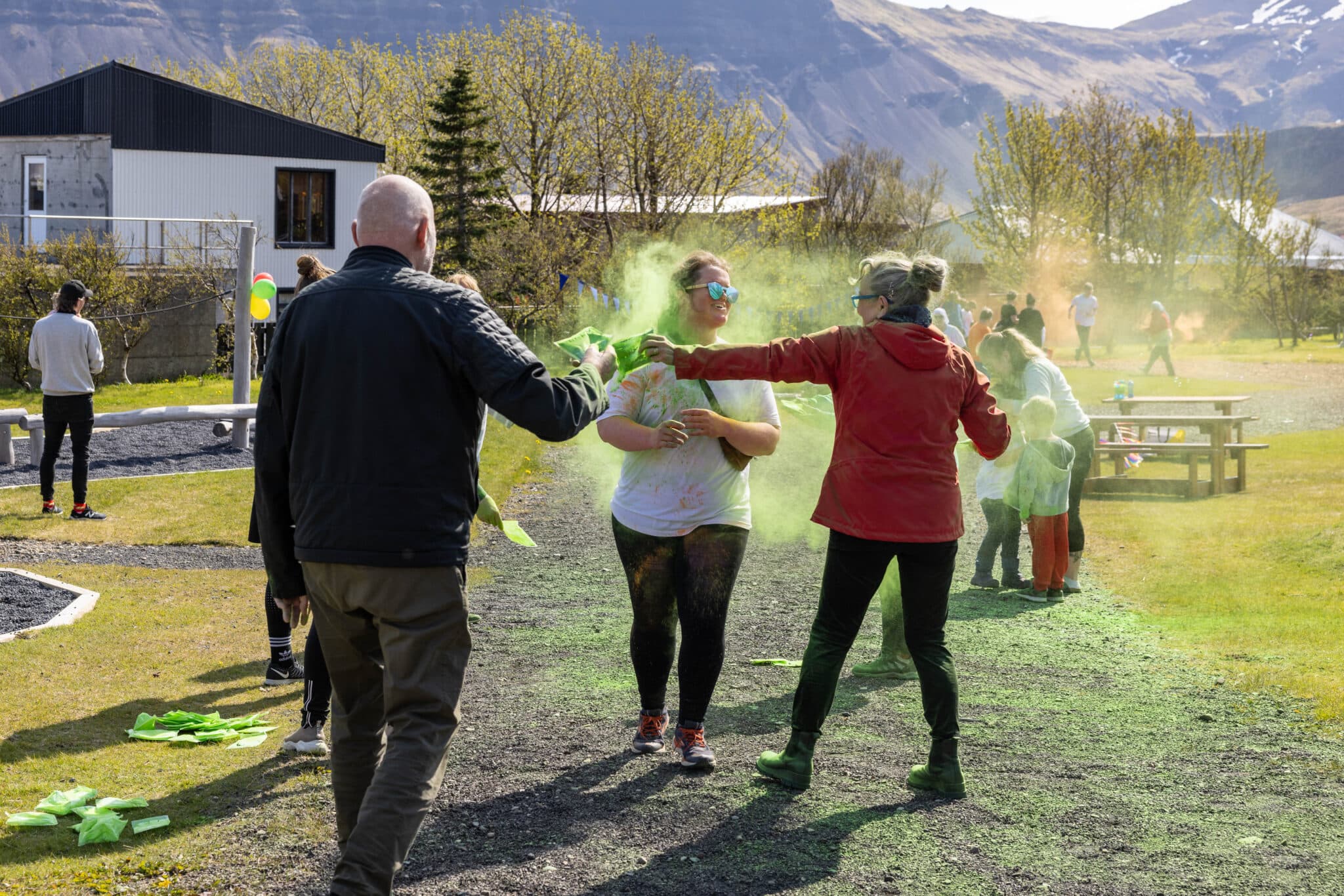 Árlegt skólahlaup Grunnskóla Grundarfjarðar fór fram í morgun. Frábært veður var og gríðarlega mikið fjör. Sú nýbreytni var þetta árið að hlaupinu var breytt í hálfgert litahlaup. Krakkarnir fengu öll boli og voru hvattir til að mæta í fötum sem mættu fá lit á sig. Svo var hlaupinn hringur í bænum þar sem fara þurfti í gegnum nokkrar litastöðvar. Stöðvarnar voru mannaðar af sjálfboðaliðum sem voru ósparir á að hella mismunandi litadufti yfir hlauparana. Svo var boðið upp á grillaðar pylsur í lok hlaups og ekki var annað að sjá en að allir hafi skemmt sér konunglega. Bæði hlauparar, litadreifarar og aðrir sem stóðu að þessu. Frábært framtak sem verður vonandi endurtekið að ári.