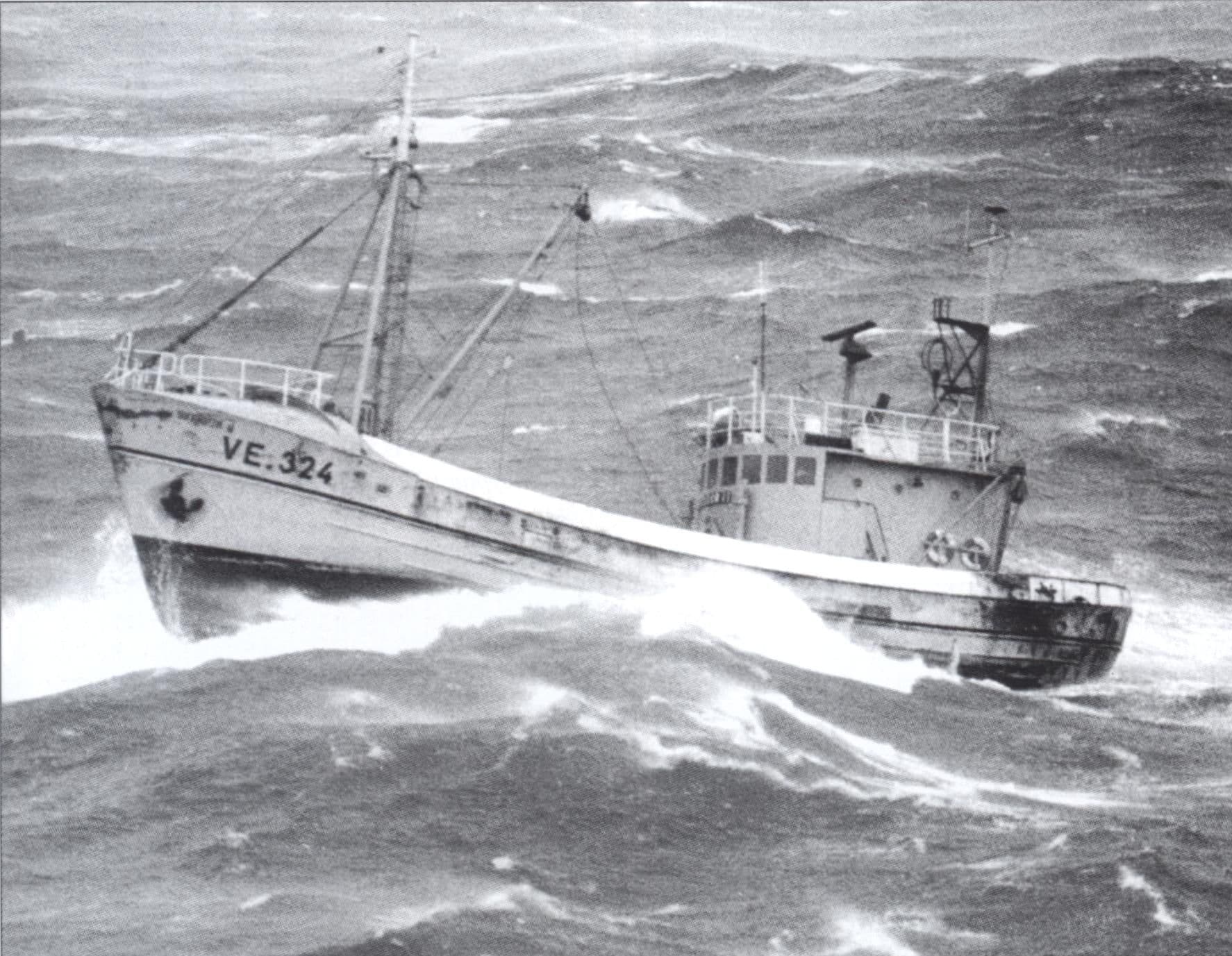 Haförninn SH hét áður Ófeigur II VE 324. Hér er skipið að nálgast Vestmannaeyjahöfn í stormi og hauga sjó 5. mars 1978. Ljósm. Sigurgeir Jónasson