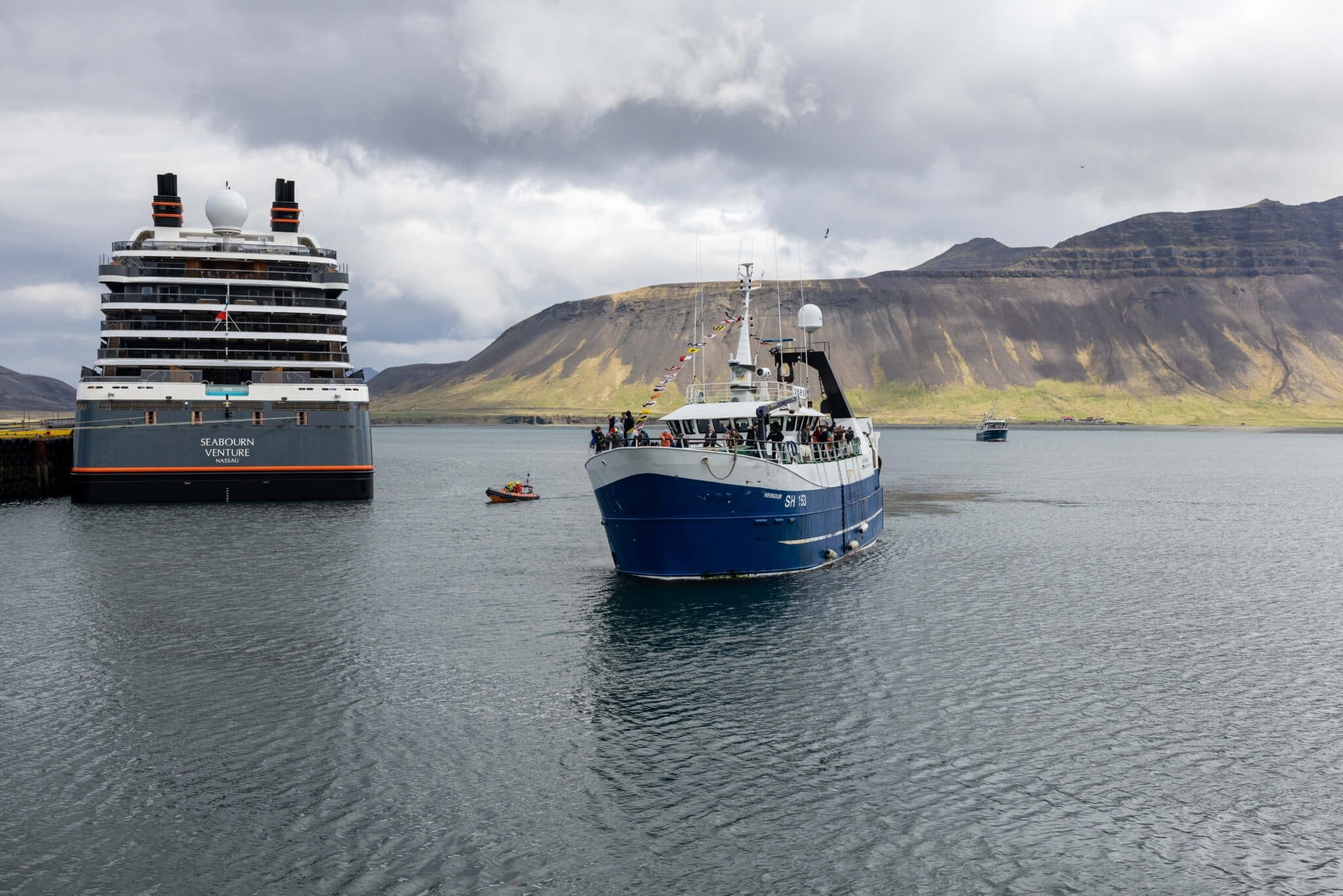 Hringur SH og Farsæll SH sáu um skemmtisiglinguna þetta árið en hér eru þeir að koma í land við hliðina á skemmtiferðaskipinu Seabourn Venture sem lá við bryggju. Ljósm. tfk.