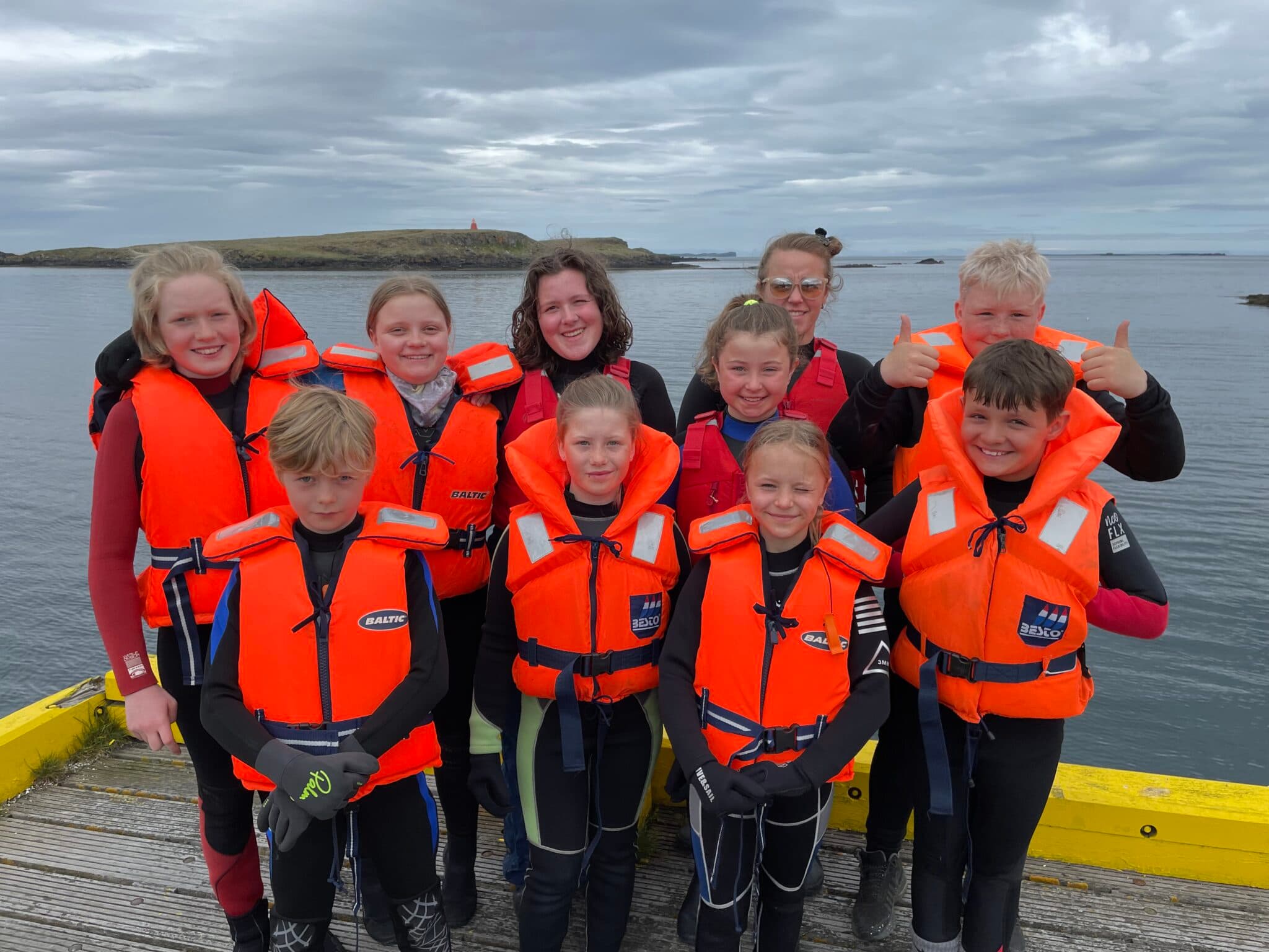 Þegar blaðamaður Skessuhorns var á göngu við höfnina í Stykkishólmi í liðinni viku sá hann hóp af krökkum vera að hoppa af bryggjunni ofan í sjóinn. Þarna voru á ferð krakkar á aldrinum 10-14 ára sem voru á siglinganámskeiði og virtust skemmta sér konunglega. Að sögn Ágústu Arnþórsdóttur leiðbeinanda á námskeiðinu sem Siglingadeild Snæfells heldur utan um er það í fjóra daga frá mánudegi til fimmtudags, fyrir og eftir hádegi þrjá tíma í senn. Þar er verið að kenna krökkunum að sigla á seglskútum og kajökum, farið á sjóbretti og stokkið í sjóinn. Ágústa segir að krökkunum finnist þetta mjög gaman, þau eru mjög áhugasöm og ekki verra þegar veðrið sé svona gott. Allt hefur gengið mjög vel á námskeiðinu og eru krakkarnir búnir að læra helling og skemmta sér í leiðinni.