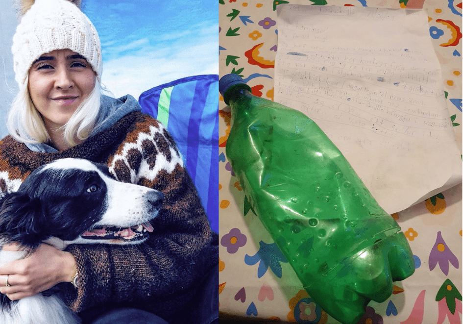 Fanney ásamt hundi sínum Skunda og flöskuskeytið sem fannst á Fremri-Langey á Breiðafirði. Ljósm. samsett:, aðsend/ruv.is.