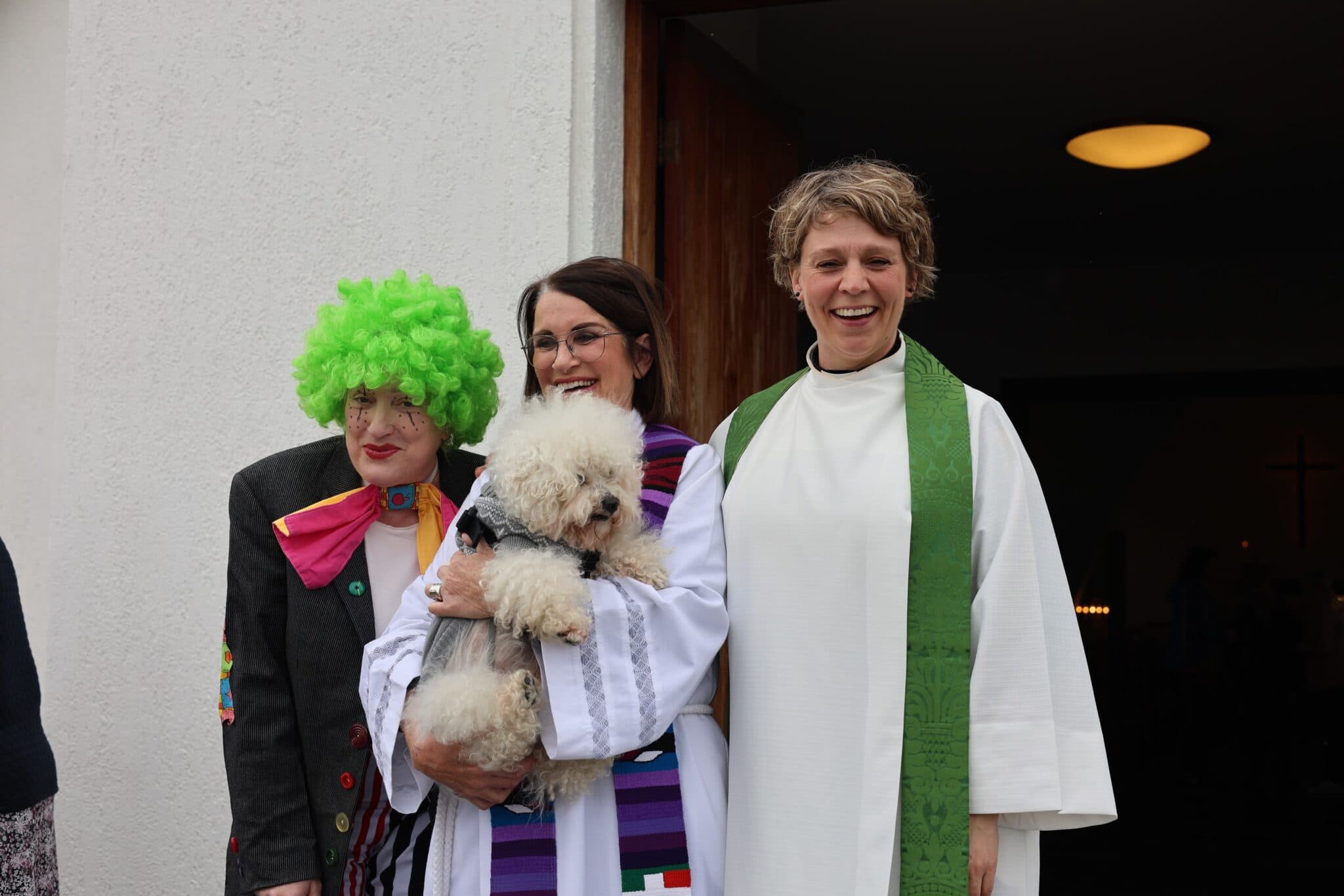 Borgarneskirkja bauð í gæludýramessu en hér eru þær Eygló Egilsdóttir, Anna Eiríksdóttir og Heiðrún Helga Bjarnadóttir að messunni lokinni með einn loðinn gest. Ljósm. sþ.