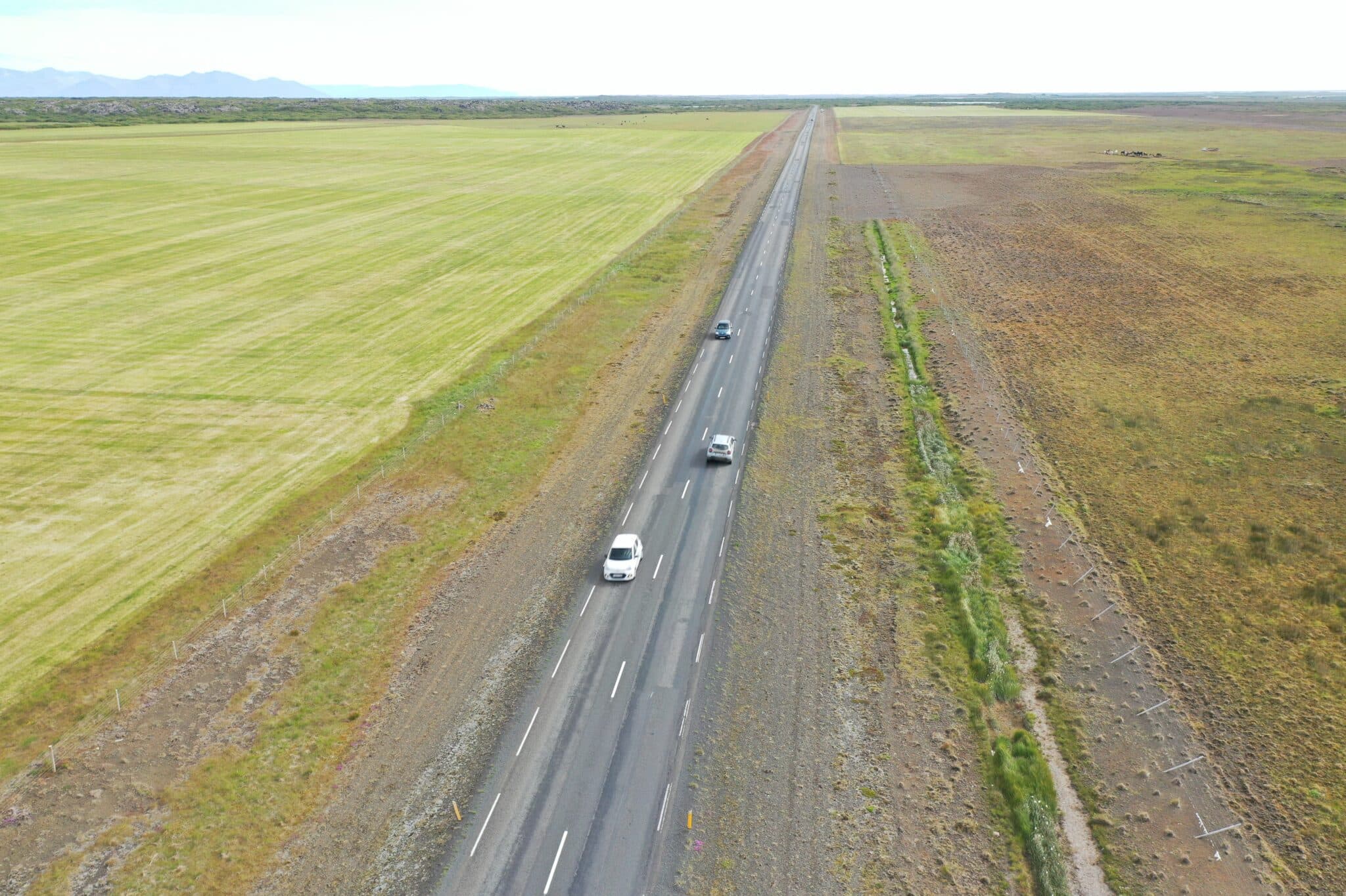 Myndin er tekin við Kaldármela. Þarna sést glöggt hvernig Vegagerðin hefur málað rendur í utanverðan veginn til að vara ökumenn við að aka ekki of utarlega á hann. Af því leiðir að lítið bil er milli bíla sem mætast á veginum. Ljósm. mm