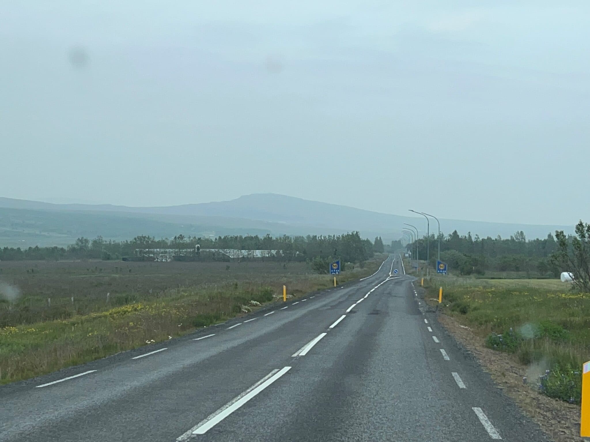 Þessi mynd var tekin í móðufylltum Reykholtsdal síðastliðið föstudagskvöld. Skáneyjarbungan er þarna hálfhulin í gosmóðu. Ljósm. gó