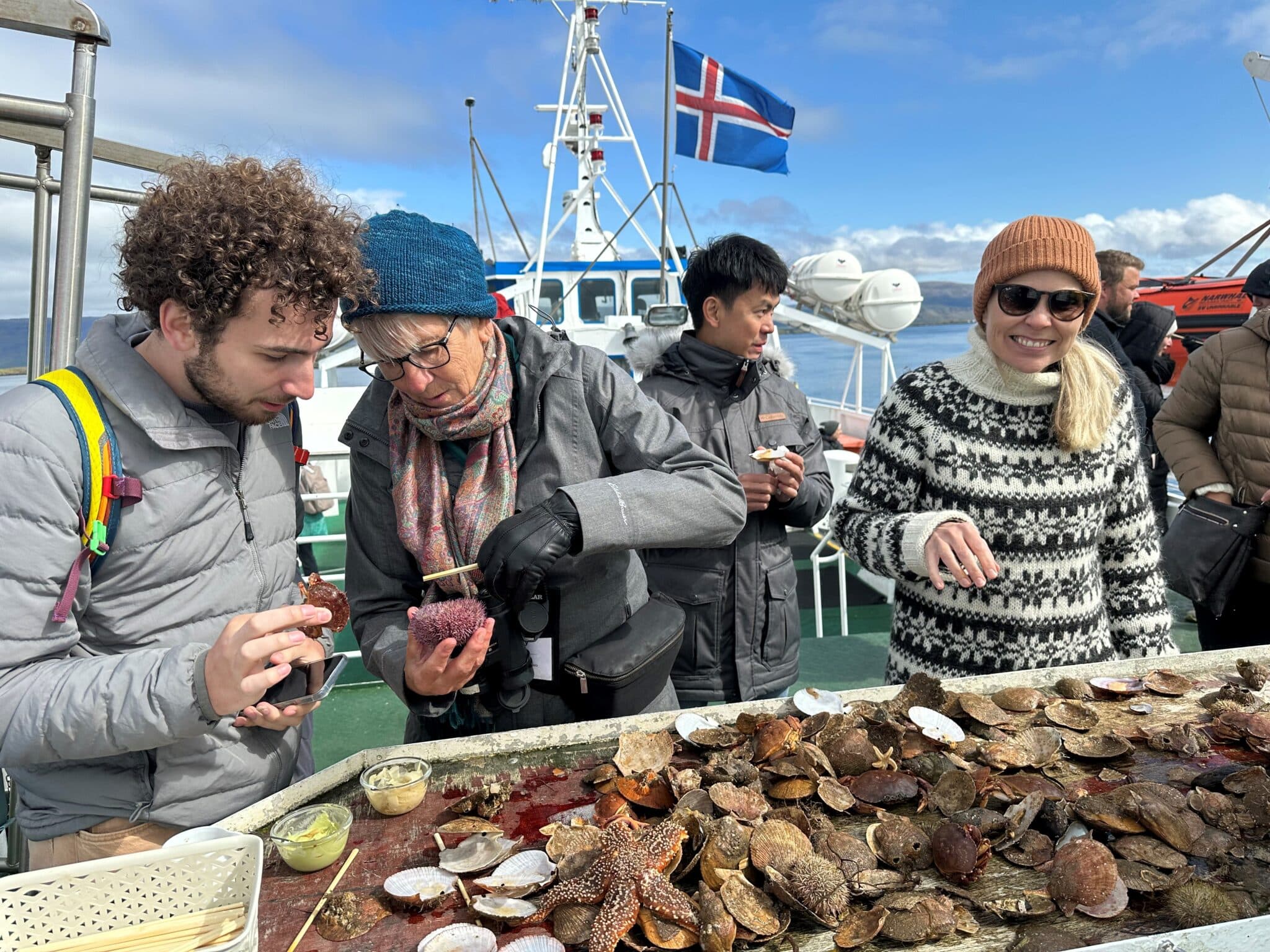 Marígull, hafkóngur, nákuðungur, kræklingur, skollakoppur, stórkrossi og fleiri tegundir af sjávarbotni þekja veisluborðið. Við erum stödd um í borð í Særúnu, tvíbytnu Sæferða í Stykkishólmi sem siglir tvisvar á dag í tveggja tíma skoðunarferðir milli eyjanna á Breiðafirði. Auk þess að sigla þétt upp að snarbröttum klettaveggjum eyjanna, þar sem fuglarnir í bjarginu taka á móti gestum af stóískri ró, er plógur dreginn eftir botninum í nokkrar mínútur. Upp kemur fjölbreytt veislufang og þaðan er nafn ferðanna Víking sushi dregið. Ekki vitum við hvort hinir sönnu víkingar nýttu sér þetta sjávarfang til átu, en vel má það vera því einmitt skammt frá þeim stað sem plógnum var skellt niður er víkin þar sem Eiríkur rauði og sonur hans Leifur áttu að hafa dvalið nokkra daga í felum eftir að hafa farið vígaför uppi á fasta landinu. Eiríki gekk eins og kunnugt er illa að lynda við aðra menn og var rekinn bæði frá Noregi og Íslandi eftir að hann var dæmdur sekur vegna vígaferla. Hann fór m.a. í Brokey á Breiðafirði en var einnig rekinn þaðan fyrir „dólg.“ Loks hélt hann í vesturátt, fann Grænland og nam þar land. Leifur sonur hans fetaði í landkönnuðarfótspor föður síns og fann Ameríku eins og frægt er orðið.