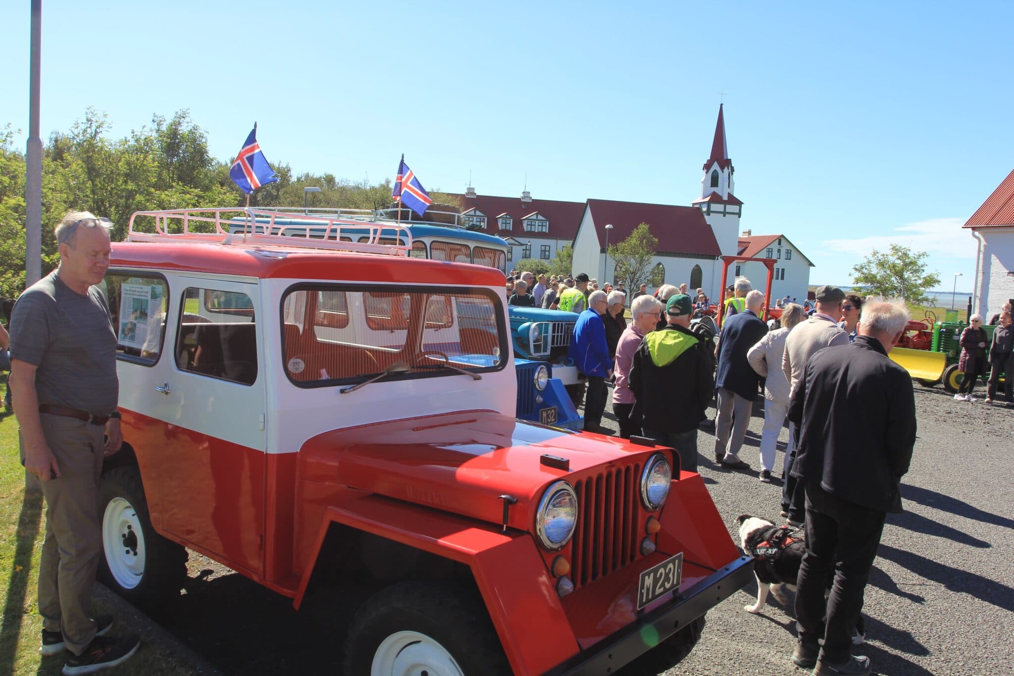 Fánum prýddur Willys jeppi Péturs Jónssonar fremstur meðal jafningja á bæjarhlaðinu.