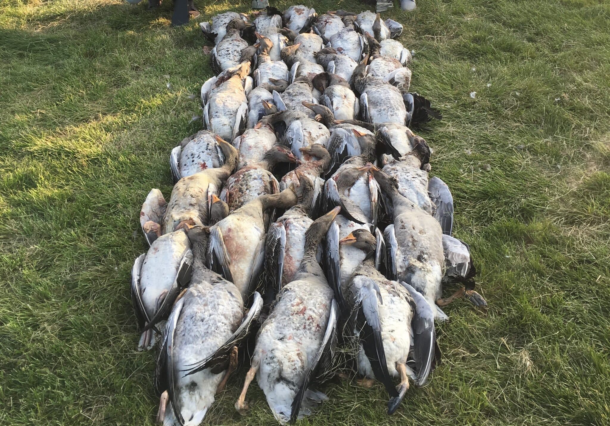 Kjöt af grágæs hefur á liðnum árum verið hluti af villibráðar veisluborði landsmanna. Veiðimenn hafa legið fyrir gæs og stundum veitt vel. Hér liggja tæplega 40 gæsir í valnum eftir vel heppnaða veiðiferð. Ljósm. úr safni Skessuhorns.