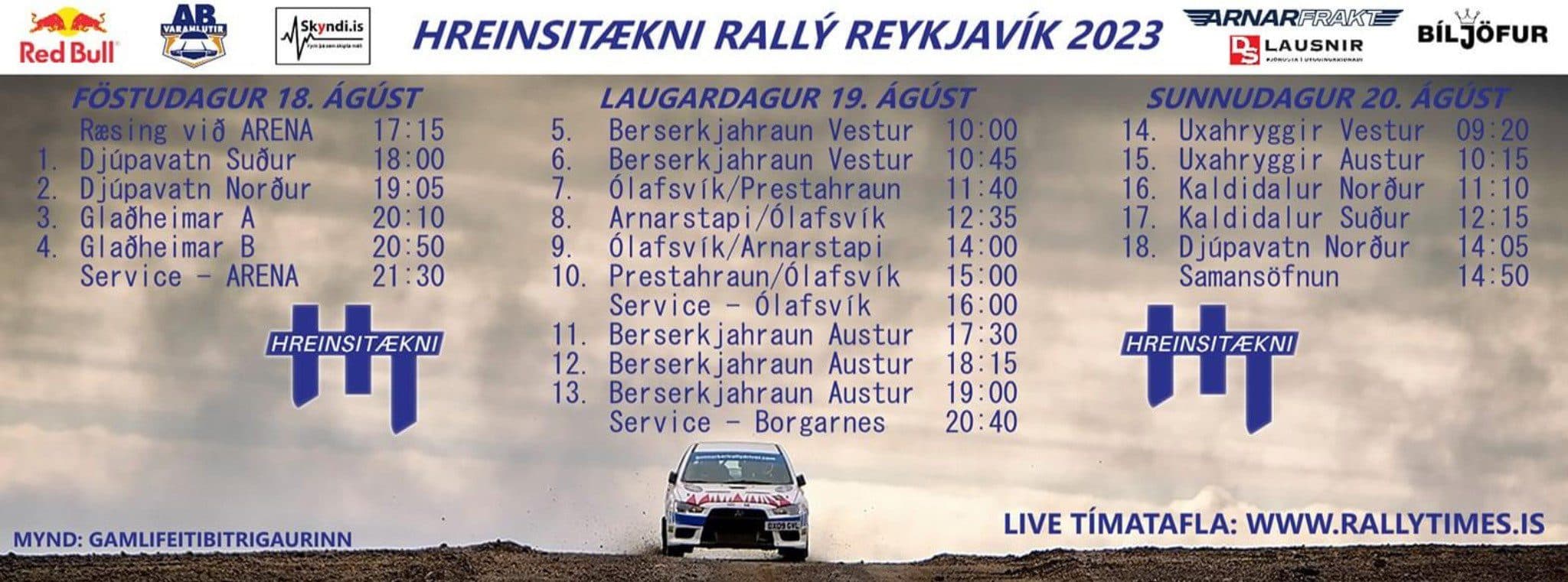 Nú um helgina, dagana 18.-20. ágúst, fer Reykjavíkur Rallý fram og er keppnin styrkt af Hreinsitækni. Ekið verður víðsvegar um suðvesturhorn landsins. Ræst verður í keppnina síðdegis í dag frá Smáratorgi og meðal annnars ekið við Djúpavatn. Á morgun laugardag verður svo ekið um Snæfellsnes. Til dæmis um Berserkjahraun, Prestahraun og Jökulháls en endað annað kvöld á viðgerðarstoppi við Olís í Borgarnesi þar sem fyrsti bíll er væntanlegur um klukkan 20:30. Á sunnudaginn liggur leiðin um Kaldadal og Uxahryggi í Borgarfirði en endað við Djúpavatn.