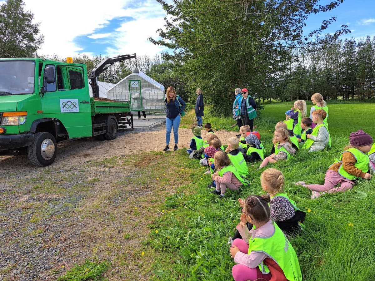 Elsta deild leikskólans Akrasels fylgdist spennt með komu Bambahússins. Ljósm. akranes.is
