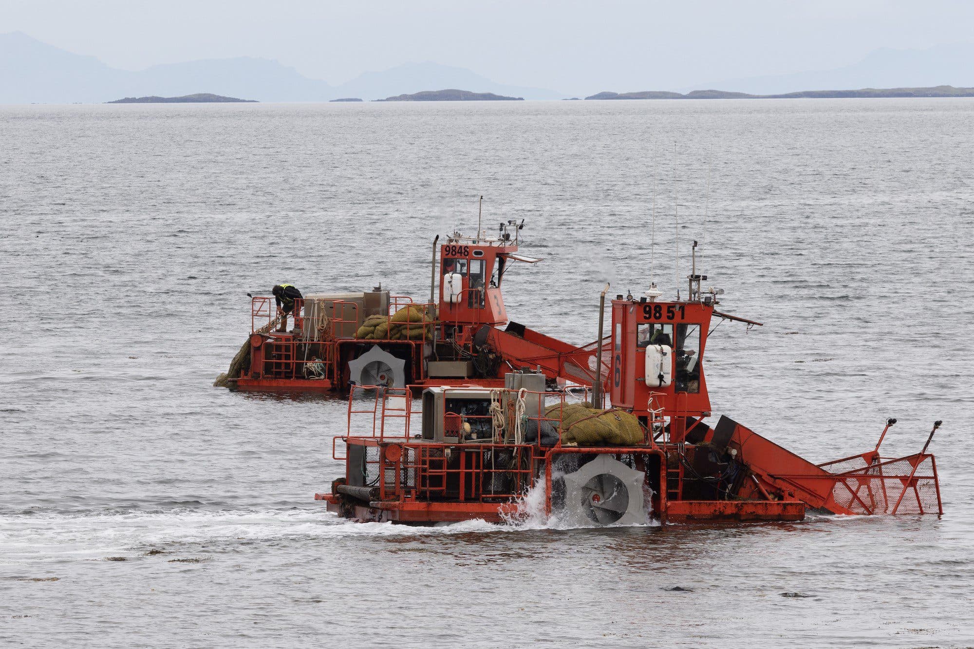 Í síðustu viku var unnið við þangslátt í Vatnsfirði á Barðaströnd. Þarna eru á ferðinni sláttuprammar frá Þörungaverksmiðjunni á Reykhólum. Verksmiðjan sækist eftir klórþangi sem vex á klöppum og skerjum en utar er það hrossaþarinn sem er sleginn þegar komið er fram á haustið. Siglt er með þang og þara á Gretti til Reykhóla þar sem í verksmiðjunni er unnið úr hráefninu ýmis efni til matargerðar og fóðrunar gripa, en einnig í snyrtivörur.