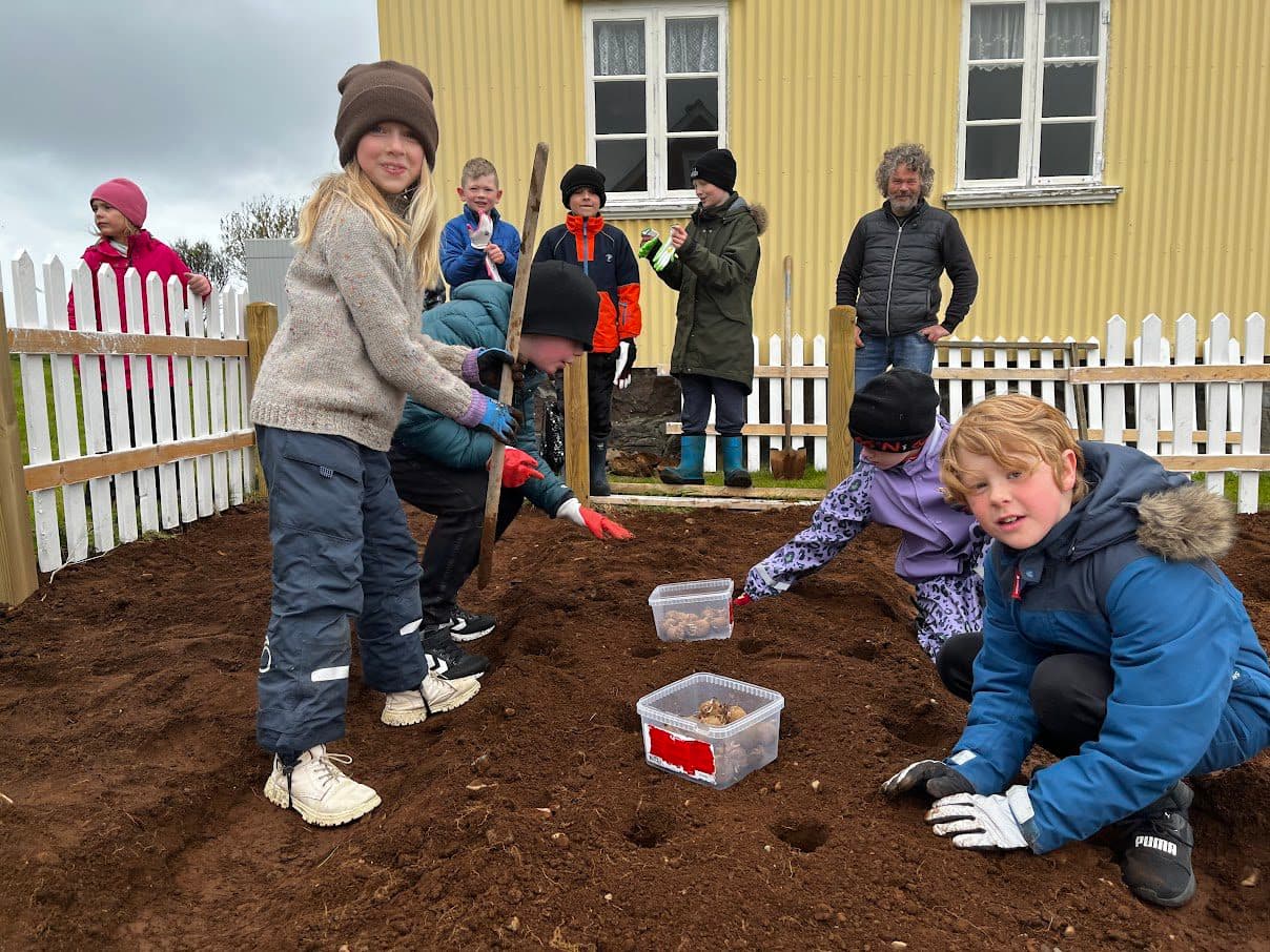 Krakkarnir voru hörkuduglegir og fylltu kartöflugarðinn á innan við klukkutíma. Síðan stráðu þau blákorni yfir. Ljósm. akranes.is