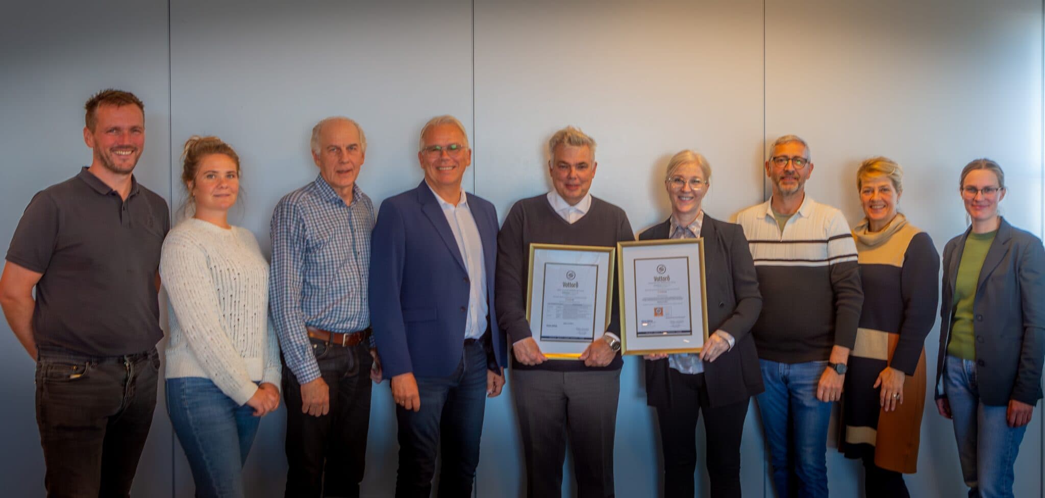 Forstjóri Límtré Vírnets ásamt fulltrúum framkvæmdastjórnar, gæðaráðs Límtré Vírnets og fulltrúum Versa Vottunar við afhendingu vottunarskírteinanna. Ljósm. aðsend