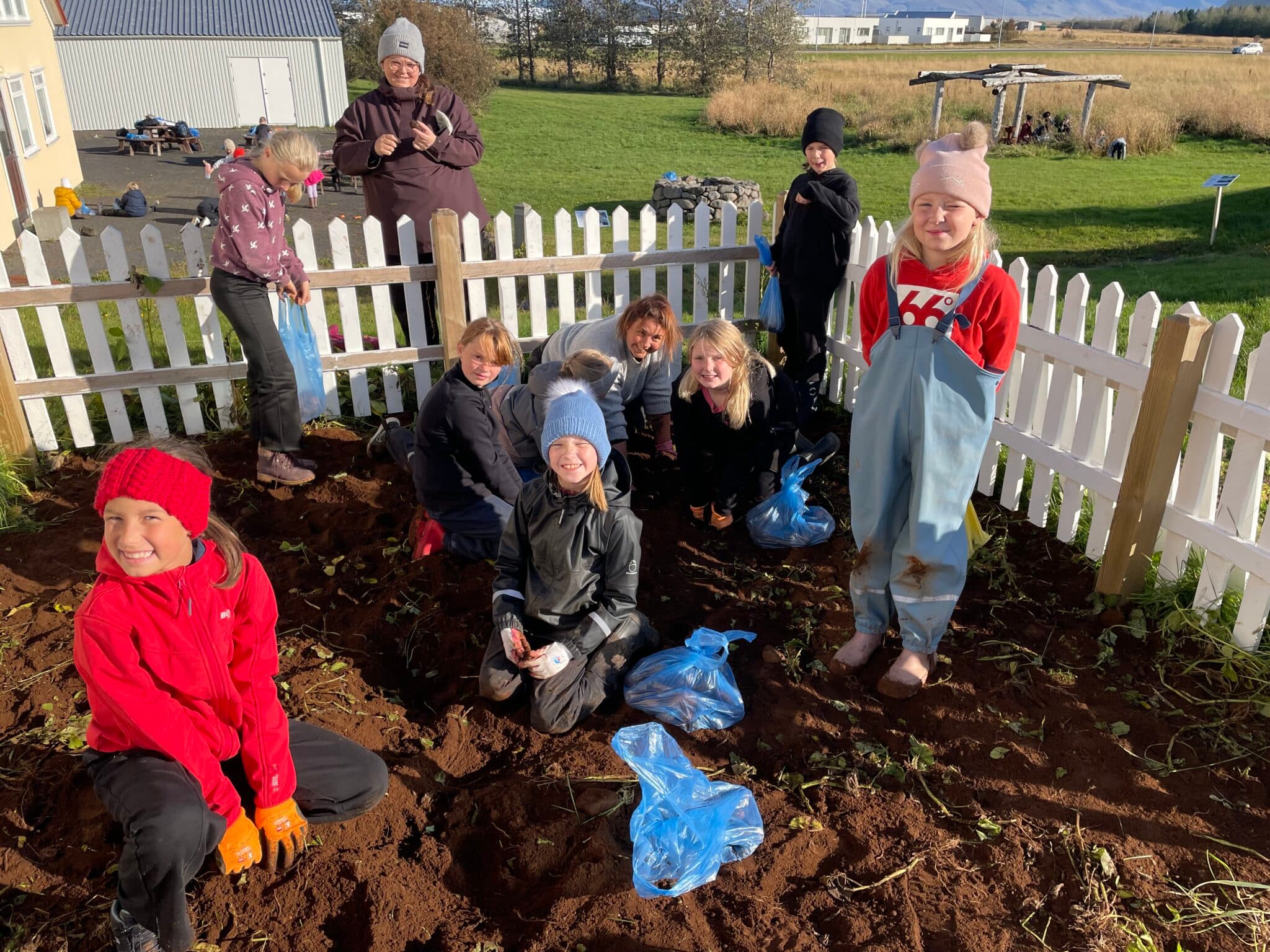 Það var mikil spenna og eftirvænting í loftinu hjá nemendum fjórða bekkjar Brekkubæjarskóla á Akranesi í morgunsárið á fimmtudaginn þegar þeir lögðu af stað á Byggðasafnið í Görðum. Í vor var kartöflugarður sem stendur við hliðina á húsinu Söndum á safnasvæðinu stunginn upp og fengu krakkarnir tvo fulla poka af útsæði ásamt bláum fjalladrottningum, gullauga og rauðum kartöflum frá Steindóri á Háteig til þess að setja niður. Þennan morgun voru þau mætt til að sjá uppskeru erfiðis síns og óhætt að segja að hún hafi verið ansi góð. Reiknaðist til að hún væri um það bil 175 kíló af rauðum, gulum og bláum kartöflum og fékk hver og einn nemandi stóran poka í hönd þegar búið var að taka upp allar kartöflurnar úr garðinum til að taka með sér heim í soðið. Blaðamaður Skessuhorns náði í skottið á þessum hressu krökkum og kennurum þeirra og tók nokkrar myndir í góða veðrinu í kartöflugörðunum heima.