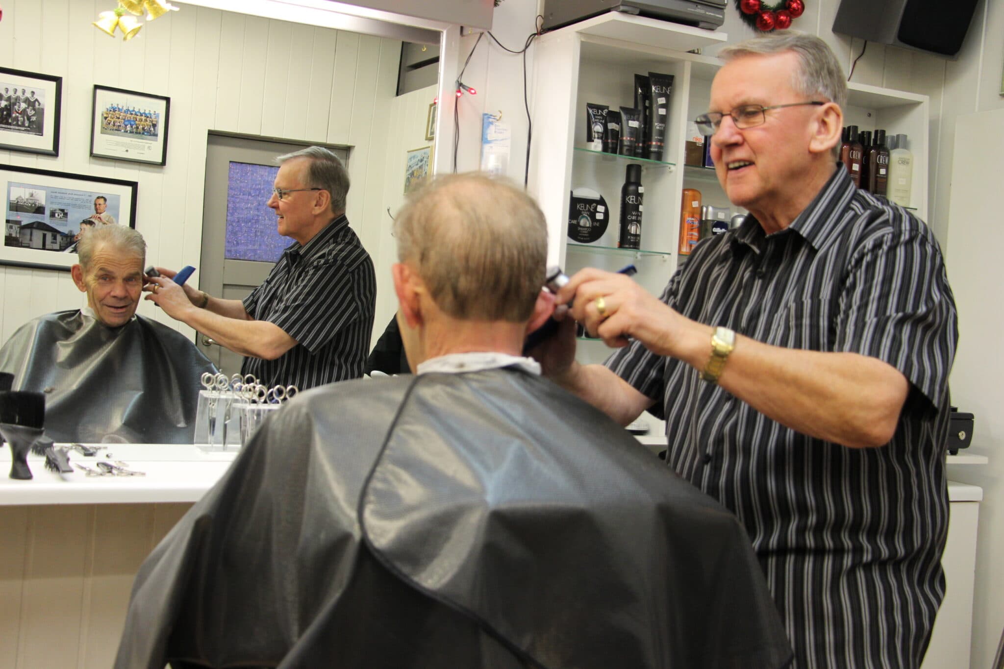 Hinni rakari á stofu sinni í desember árið 2014. Í stólnum situr Skagamaðurinn Grettir Hákonarson og fær sína hársnyrtingu fyrir jólin.