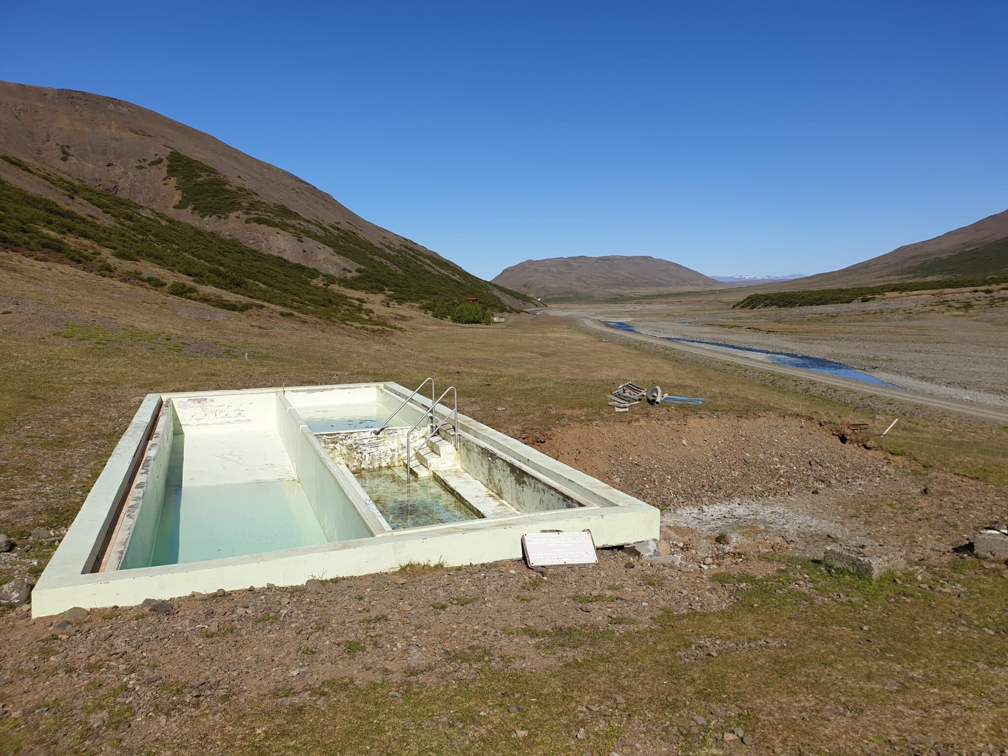 Hitaveitan nýtir vatn úr borholum við Grafarlaug í Reykjadal. Á myndinni er horft niður dalinn að Sauðafelli. Laugin var vatnslaus þegar myndin var tekin í júní 2019. Ljósm. Stefán Gíslason.