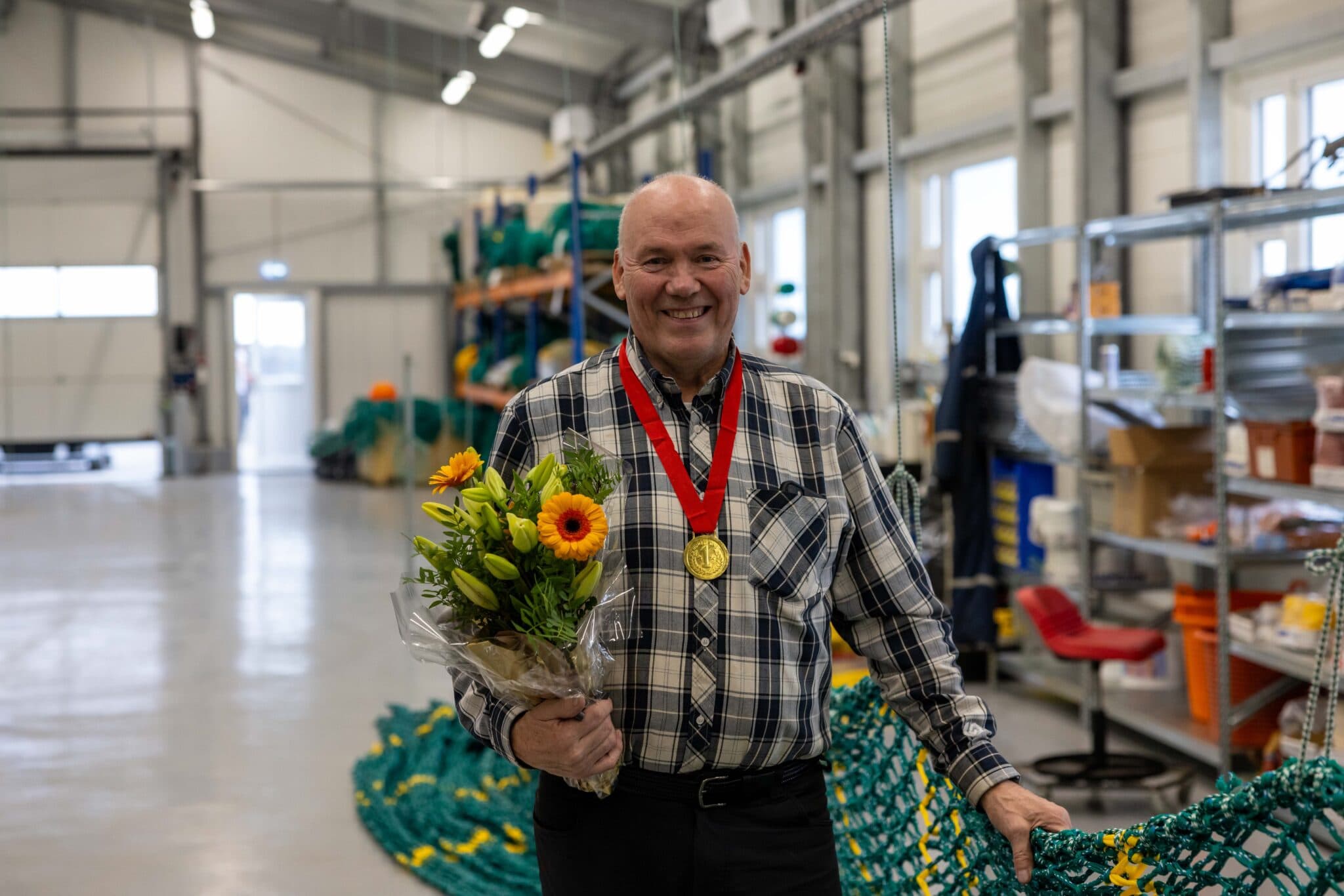 Ingi Þór kampakátur með gullmedalíu um hálsinn fyrir fyrsta sætið í spilinu ruslakall en það spil er iðulega spilað í kaffitímunum í netagerðinni. Ljósmyndir: tfk