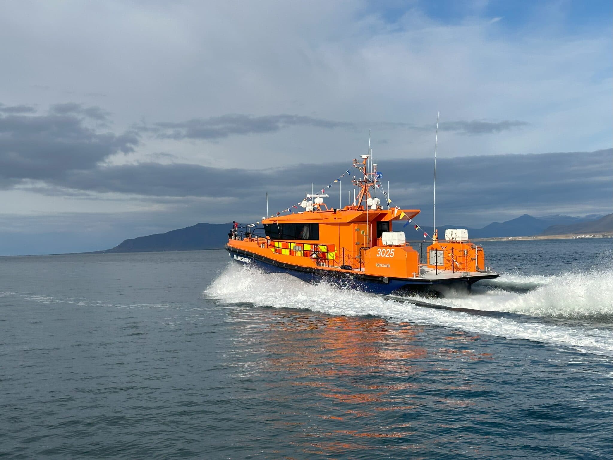 Jóhannes Briem er nýjasta björgunarskip Landsbjargar þessarar gerðar og er hér á leið til heimahafnar í Reykjavík. Áður voru sambærileg skip komin til Vestmannaeyja og Siglufjarðar. Ljósm. Landsbjörg