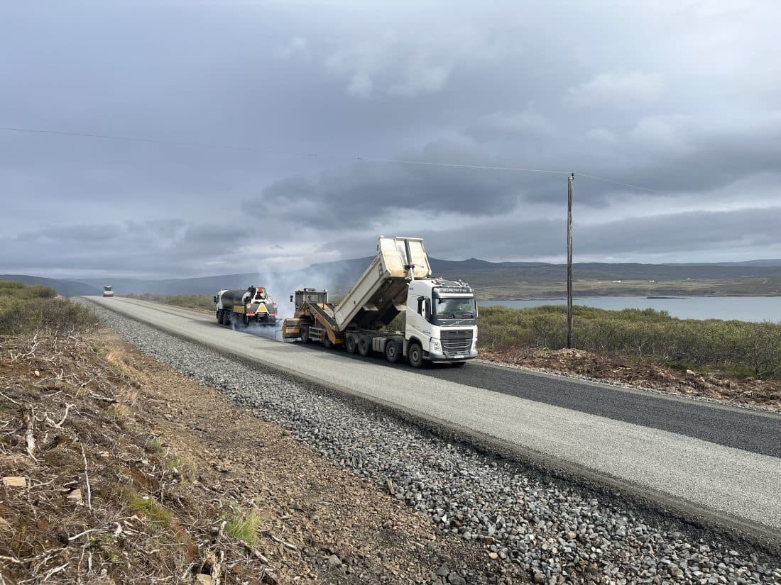 Borgarverk var fyrr í sumar að leggja klæðningu á nýja veginn um Teigsskóg. Ljósm. Vegagerðin.