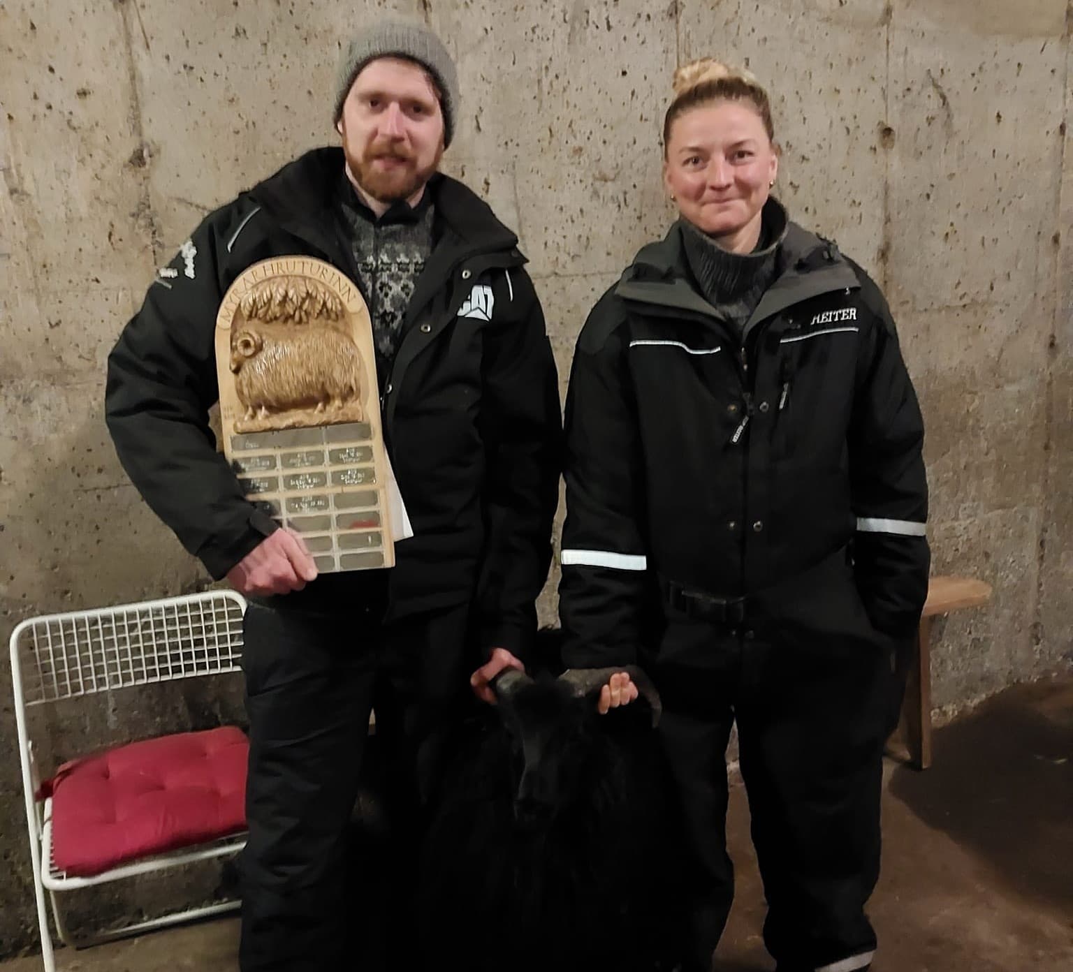 Besti hrútur sýningarinnar, eða Mýrahrúturinn 2023, var valinn svarti hrúturinn nr. 75 frá Staðarhrauni. Hér halda eigendur hans, þau Jakob Eyjólfsson og Guðdís Jónsdóttir, í hrútinn. Ljósm. Sigurjón Helgason