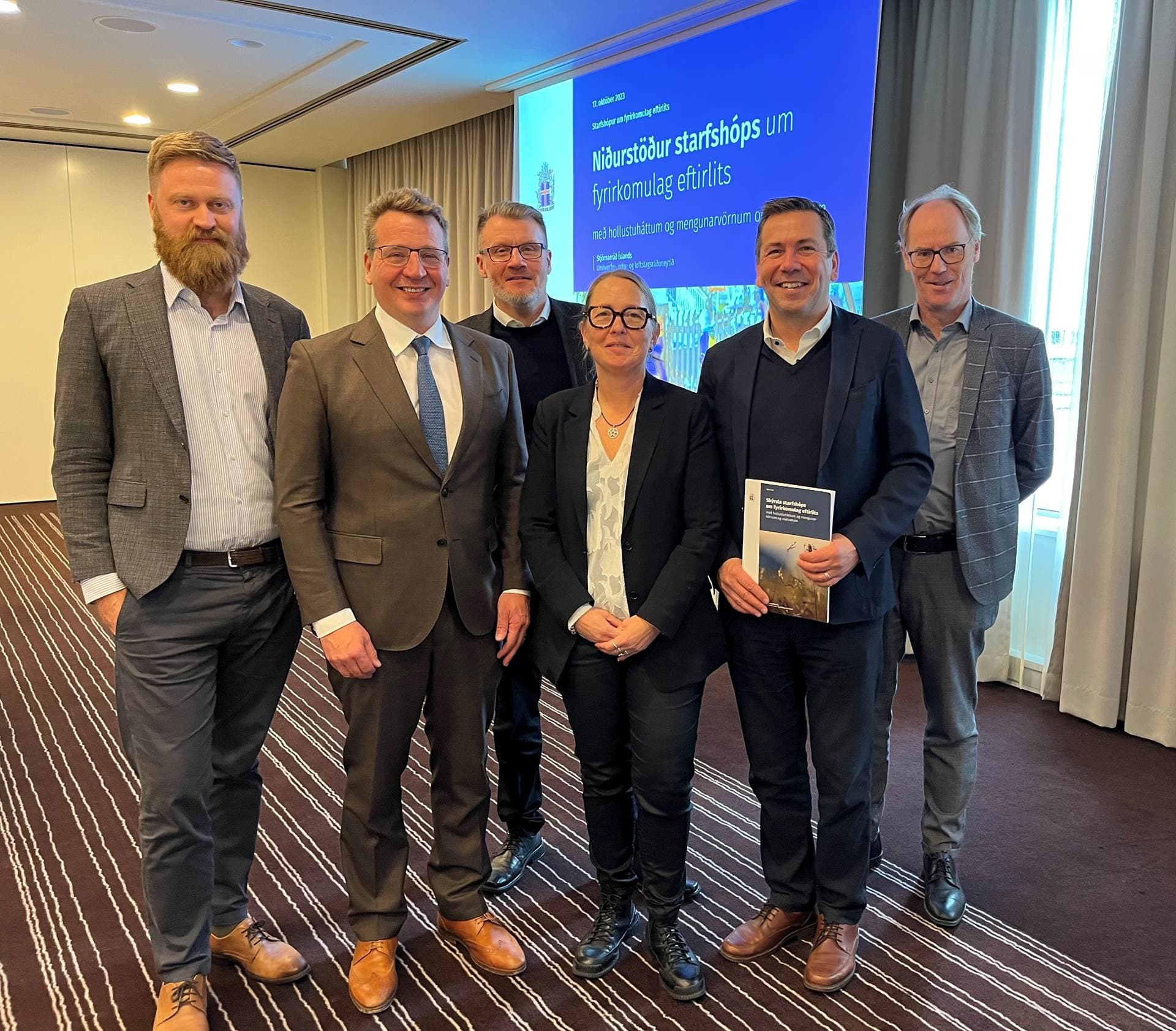 Ráðherra ásamt fulltrúum og starfsfólki starfshóps sem skilaði tillögum um framtíðar fyrirkomulag eftirlits með hollustuháttum og mengunarvörnum og matvælaeftirliti. Tillögurnar fela m.a. í sér að heilbrigðisnefndir sveitarfélaganna verða lagðar niður og starfsemi heilbrigðiseftirlits færð undir tvær ríkisstofnanir. Ljósm. Stjórnarráðið.