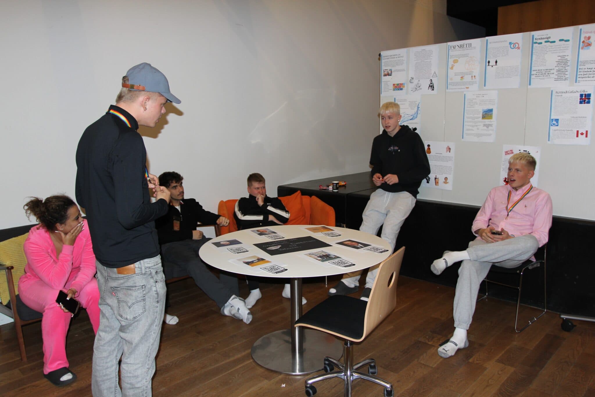 Nemendur á spjalli. Á borðinu var mynd af alþingismönnum og QR kóði þar sem hægt var að spila viðtal við þingmennina, en nemendur höfðu brugðið sér í þinghúsið við Austurvöll og tekið þá tali. Ljósm. mm