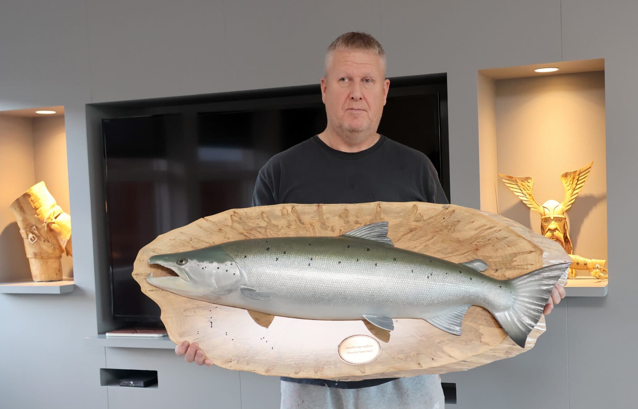 25.10.2023 10:30Vagn með laxinn góða. Í bakgrunni má sjá tvö af fyrri verkum hans. Texti og myndir: Alfons Finnsson„Vissi að lokaútkoman á vinnunni minni yrði annað hvort góð eða slæm“Skar út í tré yfir tuttugu punda lax Copy Link