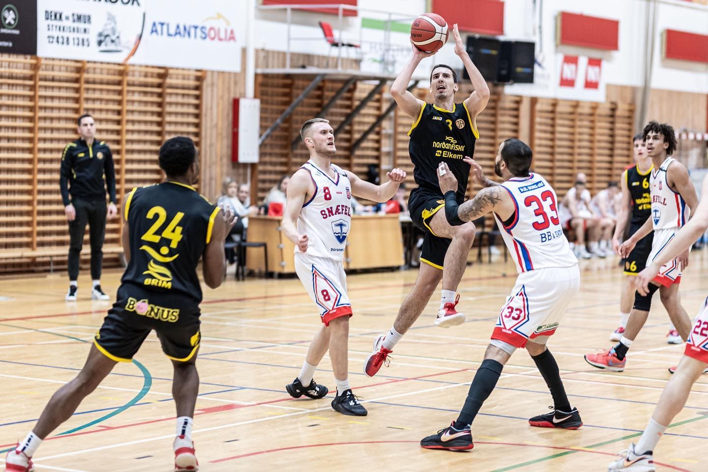 Snæfell og ÍA áttust við í Vesturlandsslag í 1. deild karla í körfuknattleik á föstudagskvöldið og var leikurinn í Stykkishólmi. Gestirnir af Skaganum voru sterkari í fyrri hálfleiknum og voru með fimm stiga forystu eftir fyrsta leikhluta, 22:27. Skagamenn fylgdu þessu vel eftir í öðrum leikhluta, bættu enn meir við forskotið og þegar flautað var til loka fyrri hálfleiks var munurinn kominn í heil sextán stig, staðan 34:50 fyrir ÍA og ljóst að heimamenn þyrftu að snúa gengi sínu við sem fyrst svo ekki illa færi.