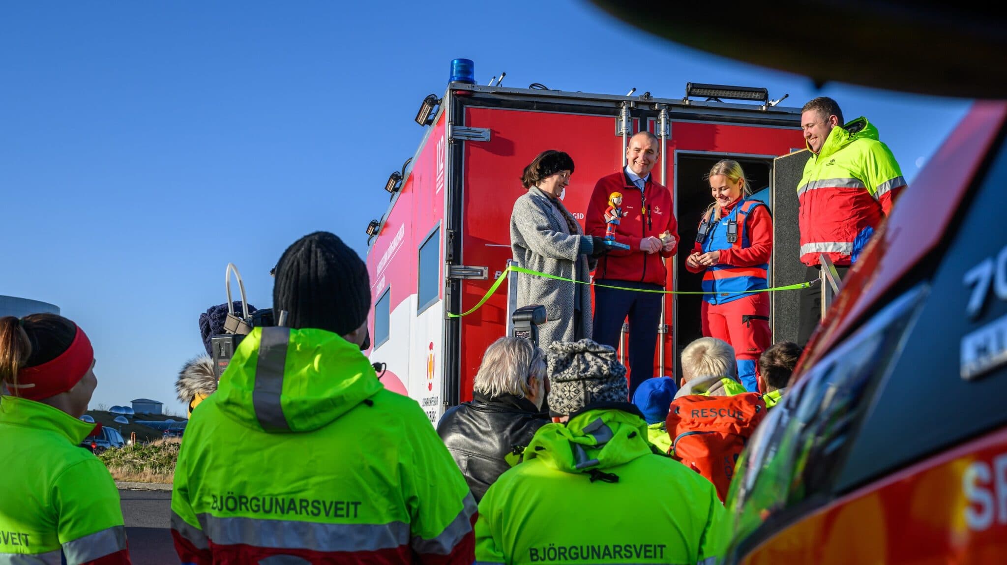 Sala neyðarkalls björgunarsveitanna hófst í gær og stendur út helgina um allt land. Í gær hleyptu forsetahjónin sölunni af stað með formlegum hætti. Guðni forseti og Eliza Reid tóku við stórum Neyðarkalli við færanlega stjórnstöð björgunarsveita á SV-horninu, við Perluna. Neyðarkall 2023 er aðgerðastjórnandi og aðgerðastjórnandinn Karen Lárusdóttir, sem einnig er glettilega lík Neyðarkalli 2023, útskýrði hlutverk aðgerðastjórnanda fyrir forsetanum og sýndi honum inn í stjórnstöðina og hvernig aðgerðir eru skipulagðar og þeim stýrt.